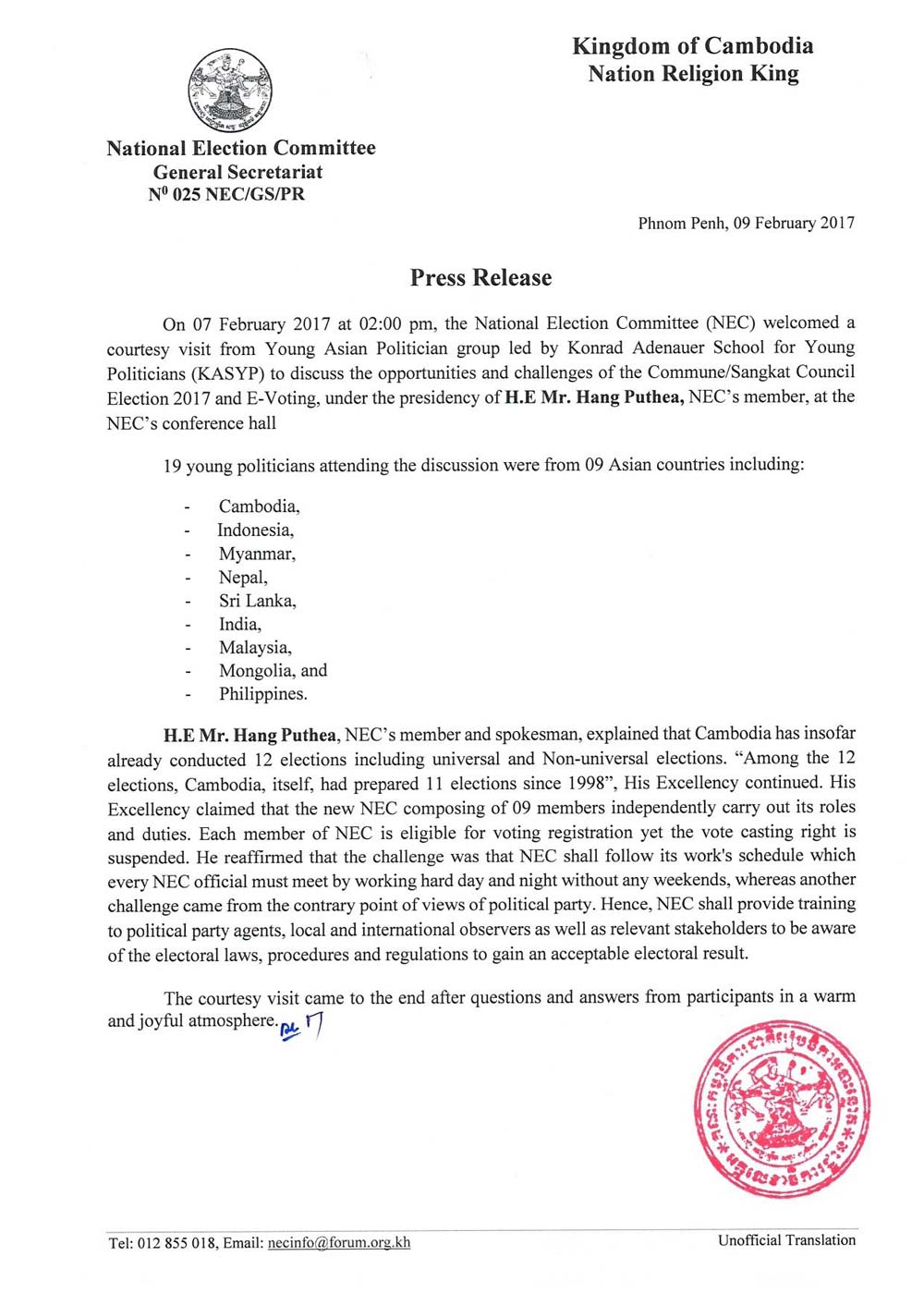 NEC welcomed a courtesy visit from Young Asian Politician group led by Konrad Adenauer School for Young Politicians (KASYP) to discuss the opportunities and challenges of the Commune/Sangkat Council Election 2017 and E-Voting