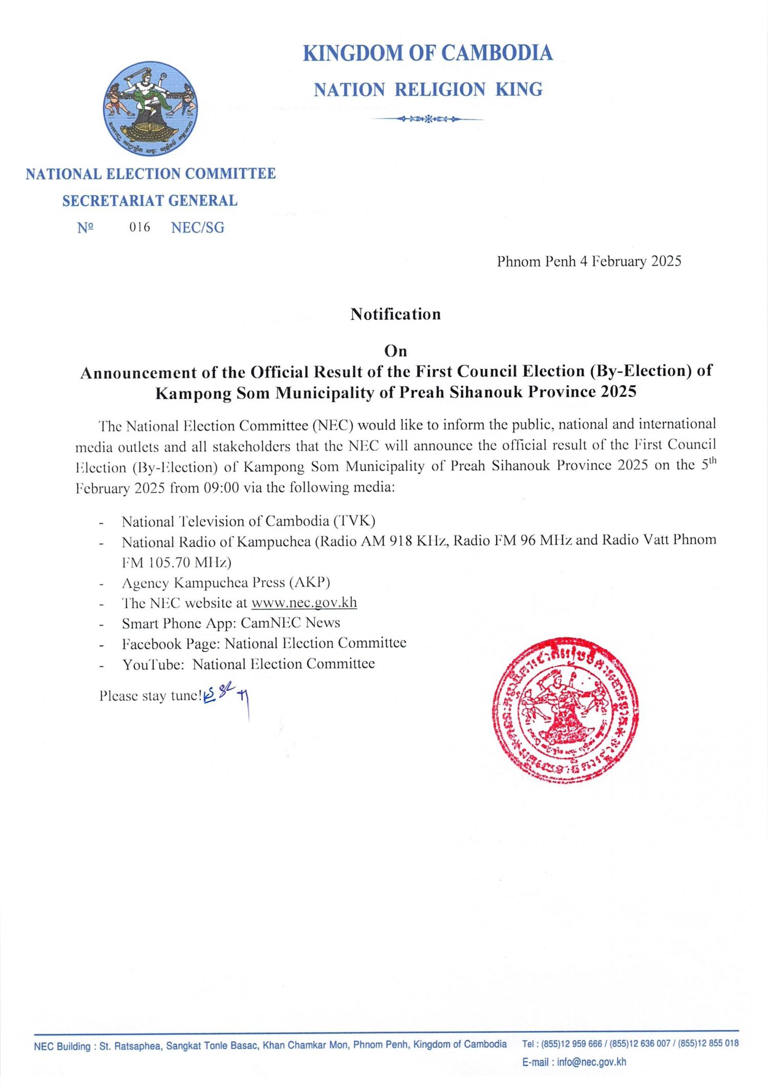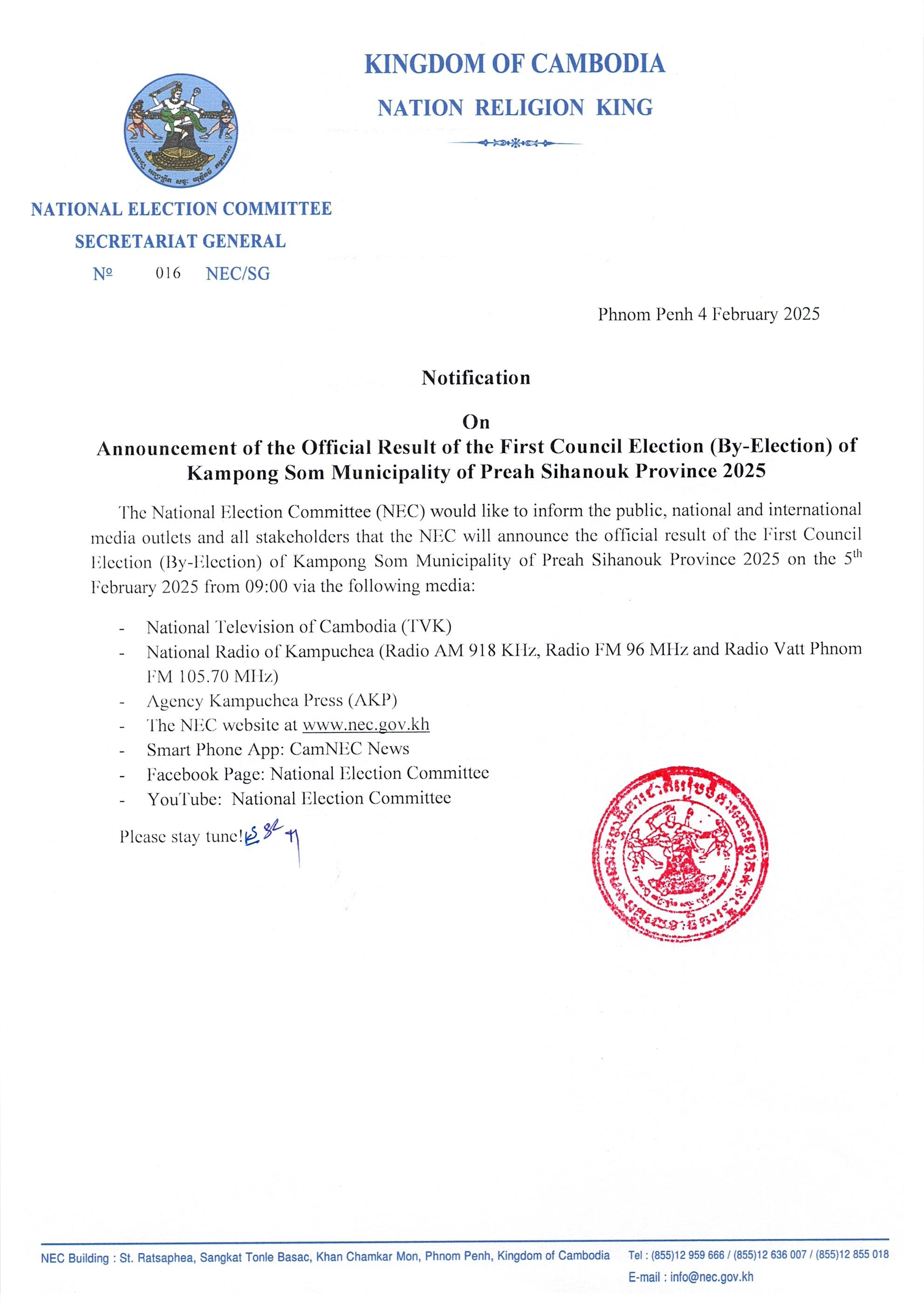 Notification On Announcement of the Official Result of the First Council Election (By-Election) of Kampong Som Municipality of Preah Sihanouk Province 2025