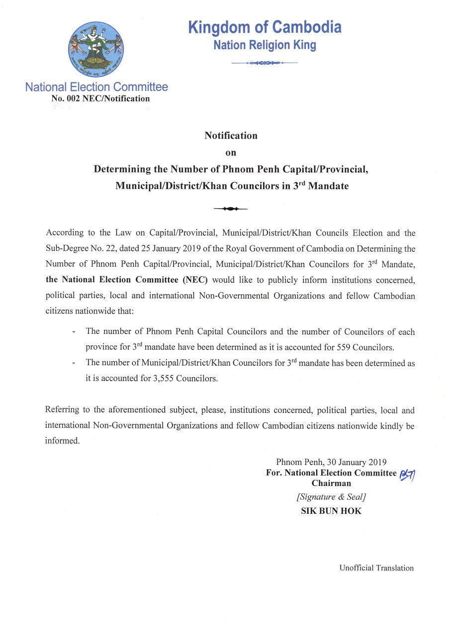 Notification on Determining the Number of Phnom Penh Capital/Provincial Municipal/District/Khan Councilors in 3rd Mandate