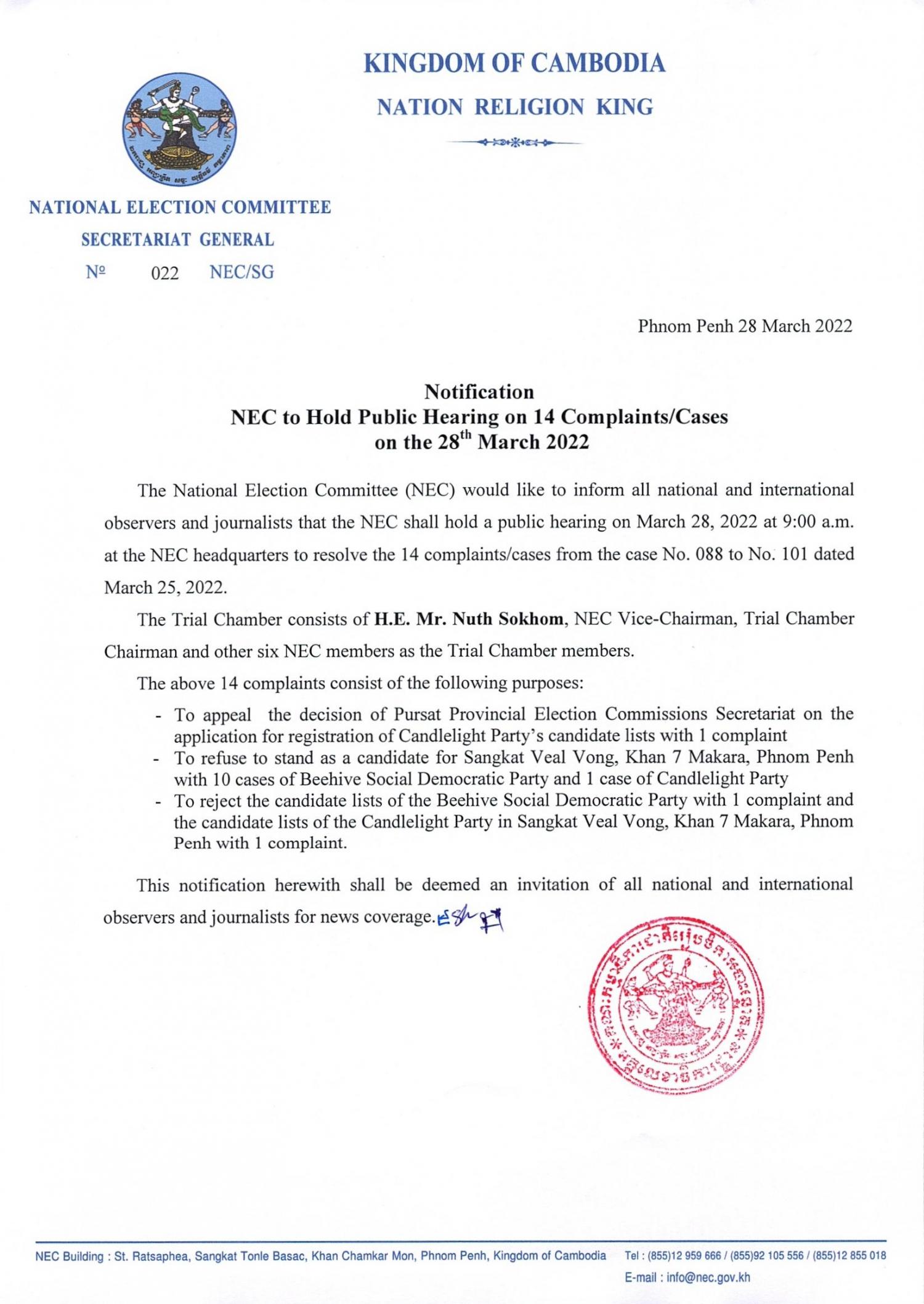 Notification : NEC to Hold Public Hearing on 14 Complaints/Cases on the 28th March 2022