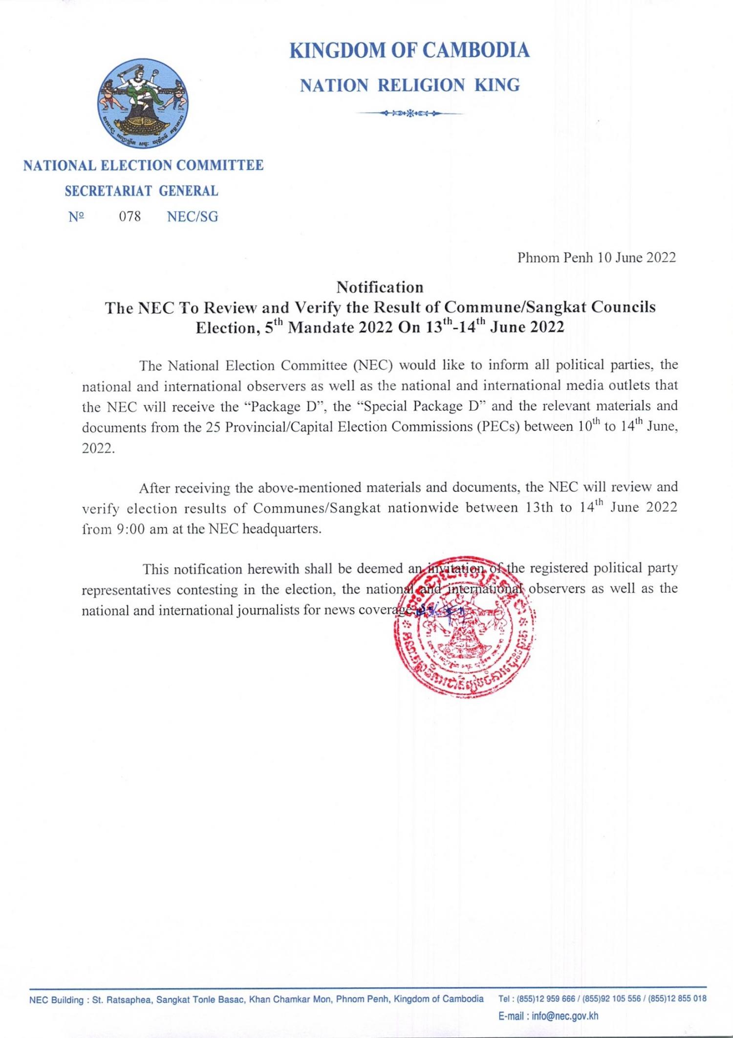 Notification : The NEC To Review and Verify the Result of Commune/Sangkat Councils Election,5th Mandate 2022 On 13th-14th June 2022