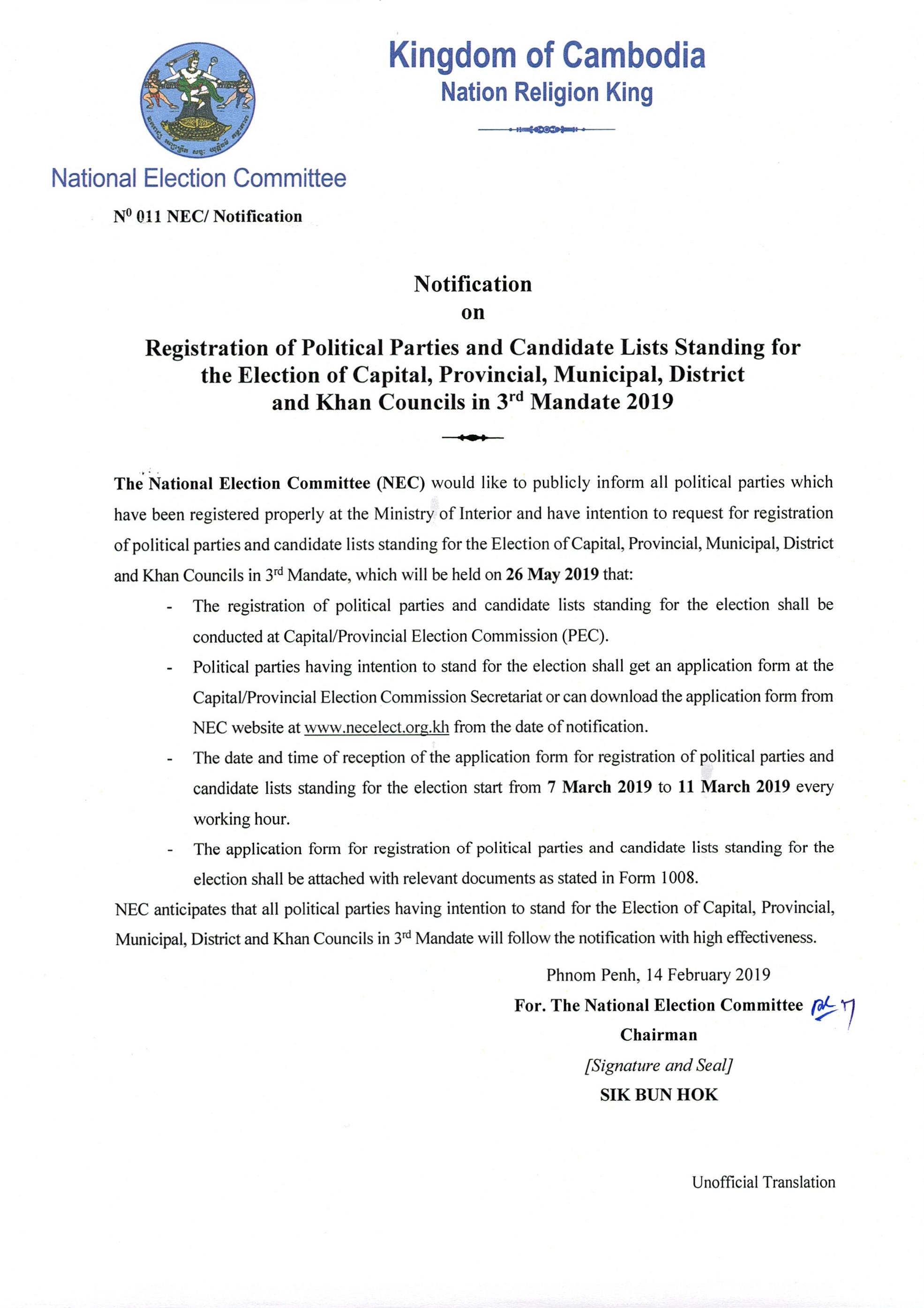 - Political parties having intention to stand for the election shall get an application form at the Capital/Provincial Election Commission Secretariat or can download the application form from NEC website at www.nec.gov.kh from the date of notification.