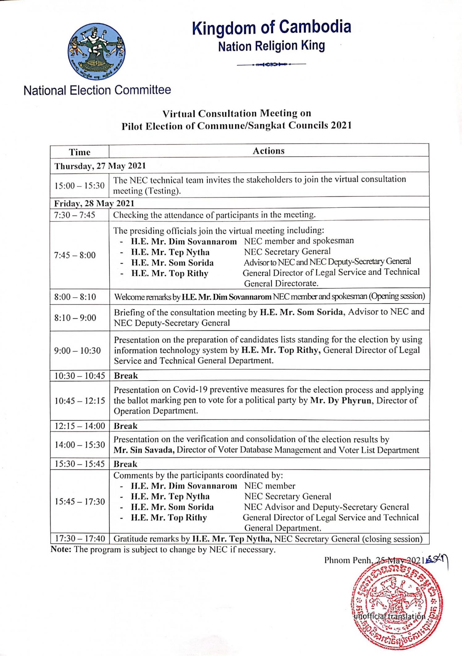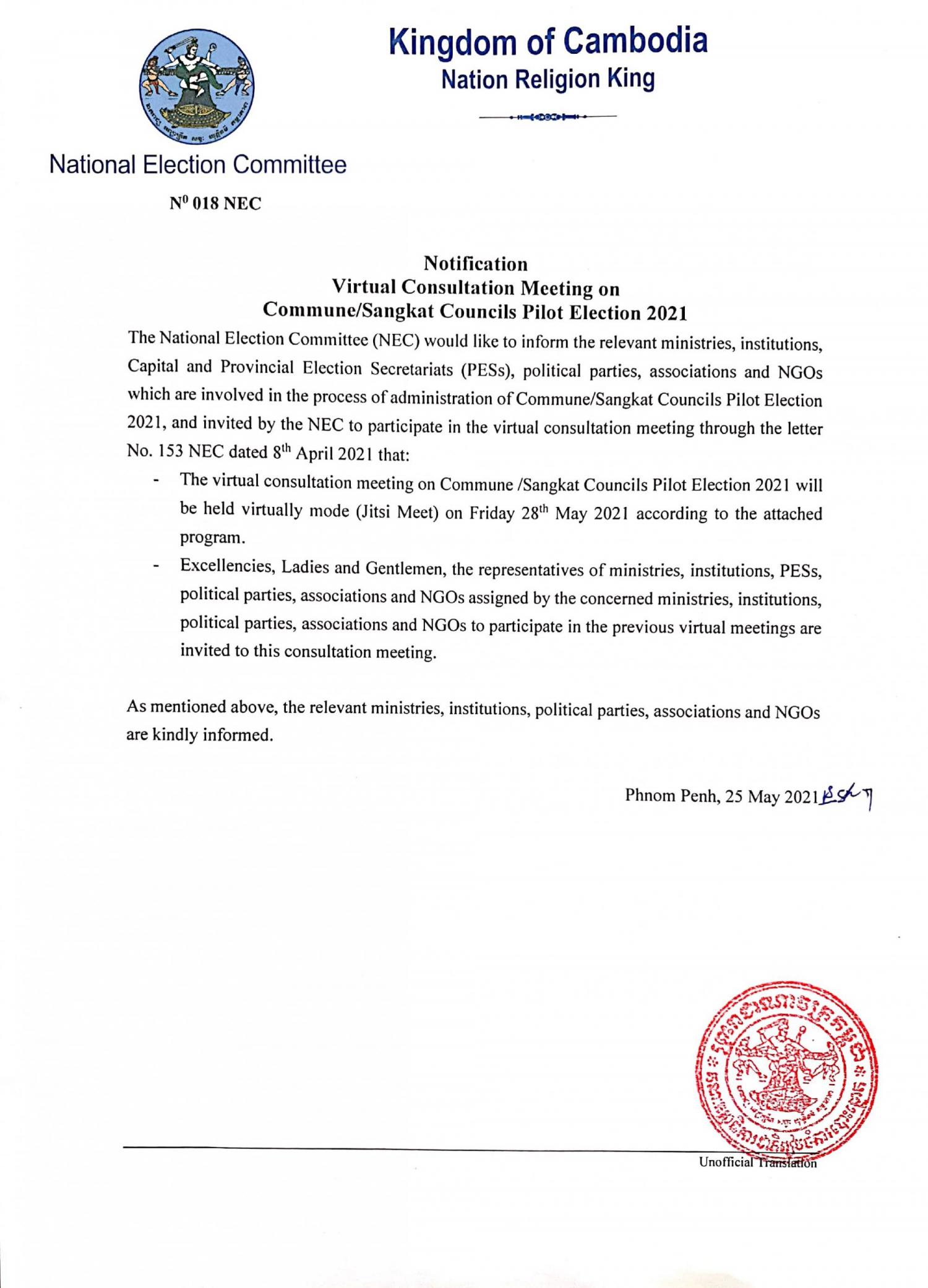 Notification: Virtual Consultation Meeting on Commune/Sangkat Councils Pilot Election 2021