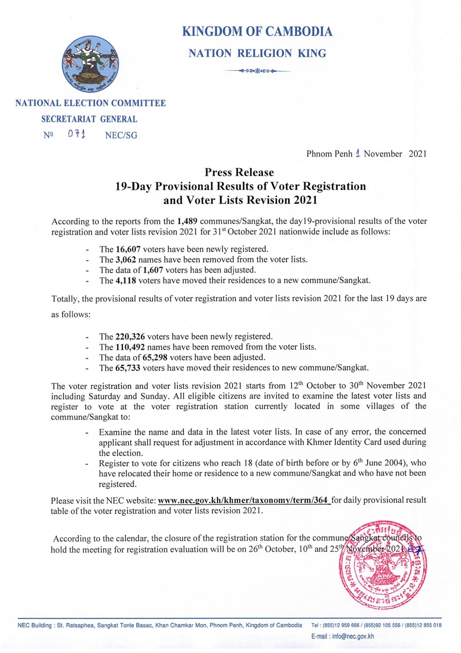 Press Release : 19-Day Provisional Results of Voter Registration and Voter Lists Revision 2021