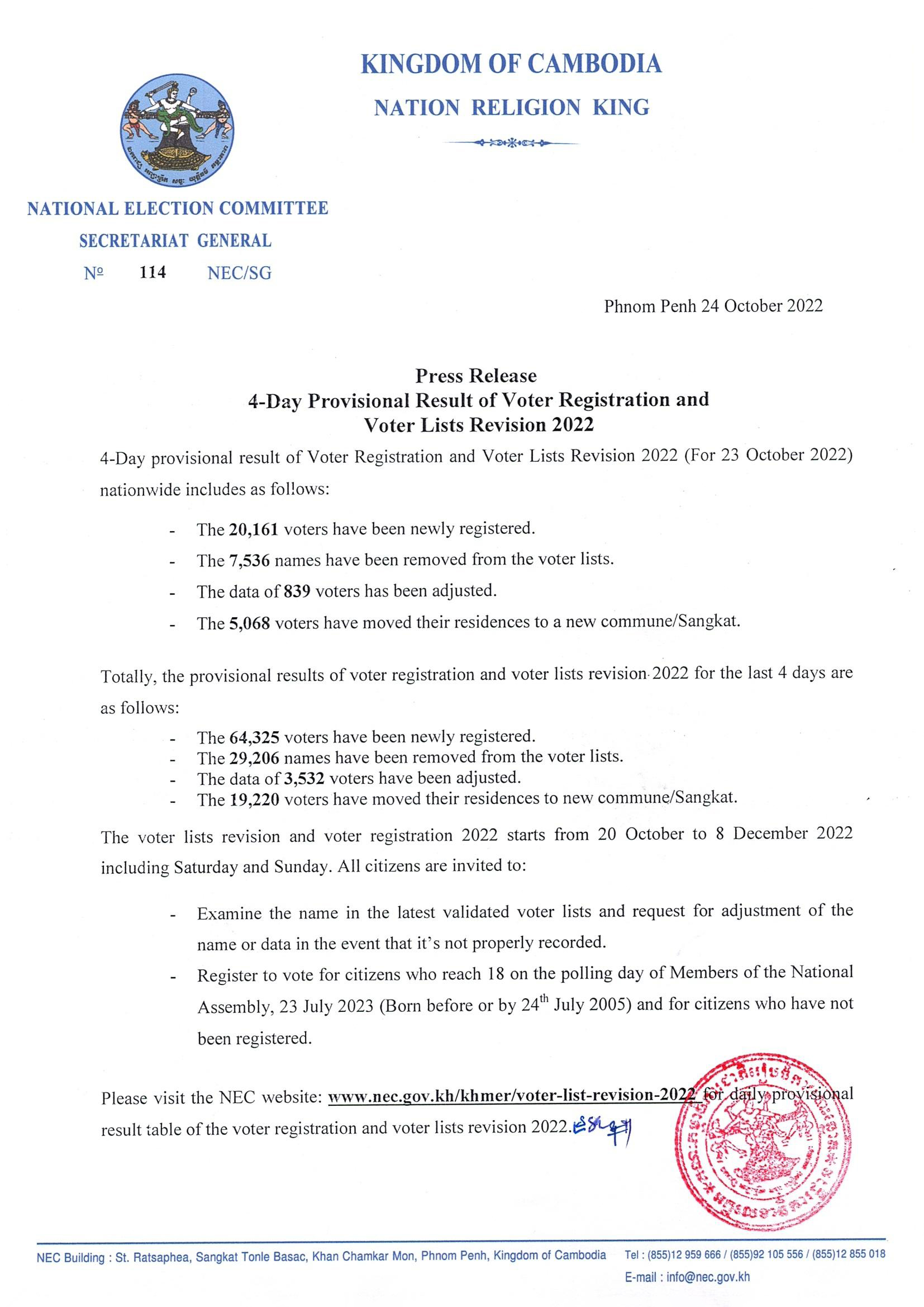 Press Release: 4-Day Provisional Result of Voter Registration and Voter Lists Revision 2022