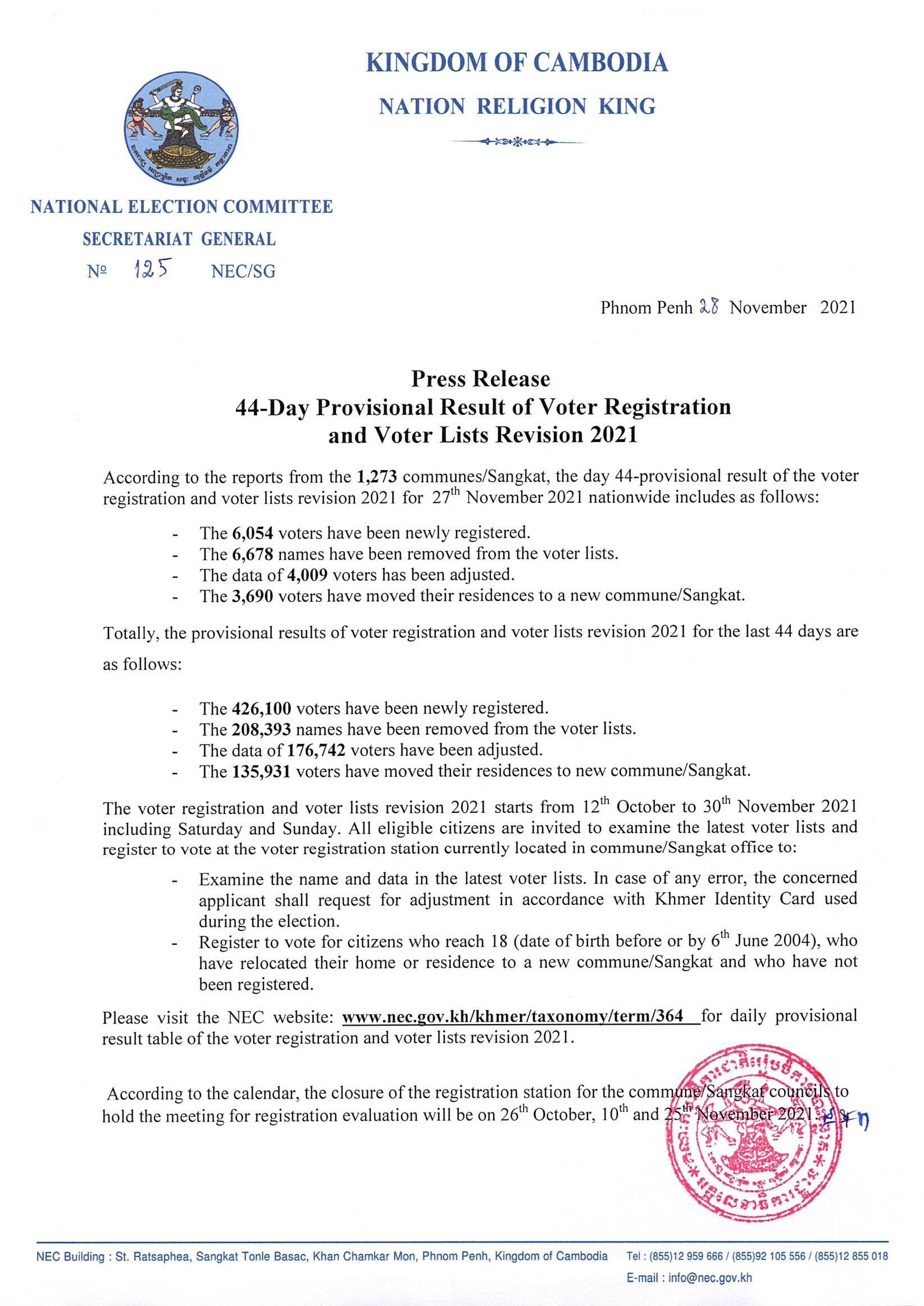 Press Release : 44-Day Provisional Result of Voter Registration and Voter Lists Revision 2021