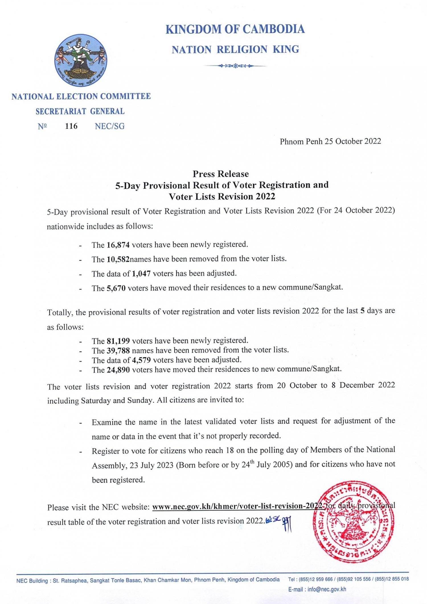 Press Release: 5-Day Provisional Result of Voter Registration and Voter Lists Revision 2022