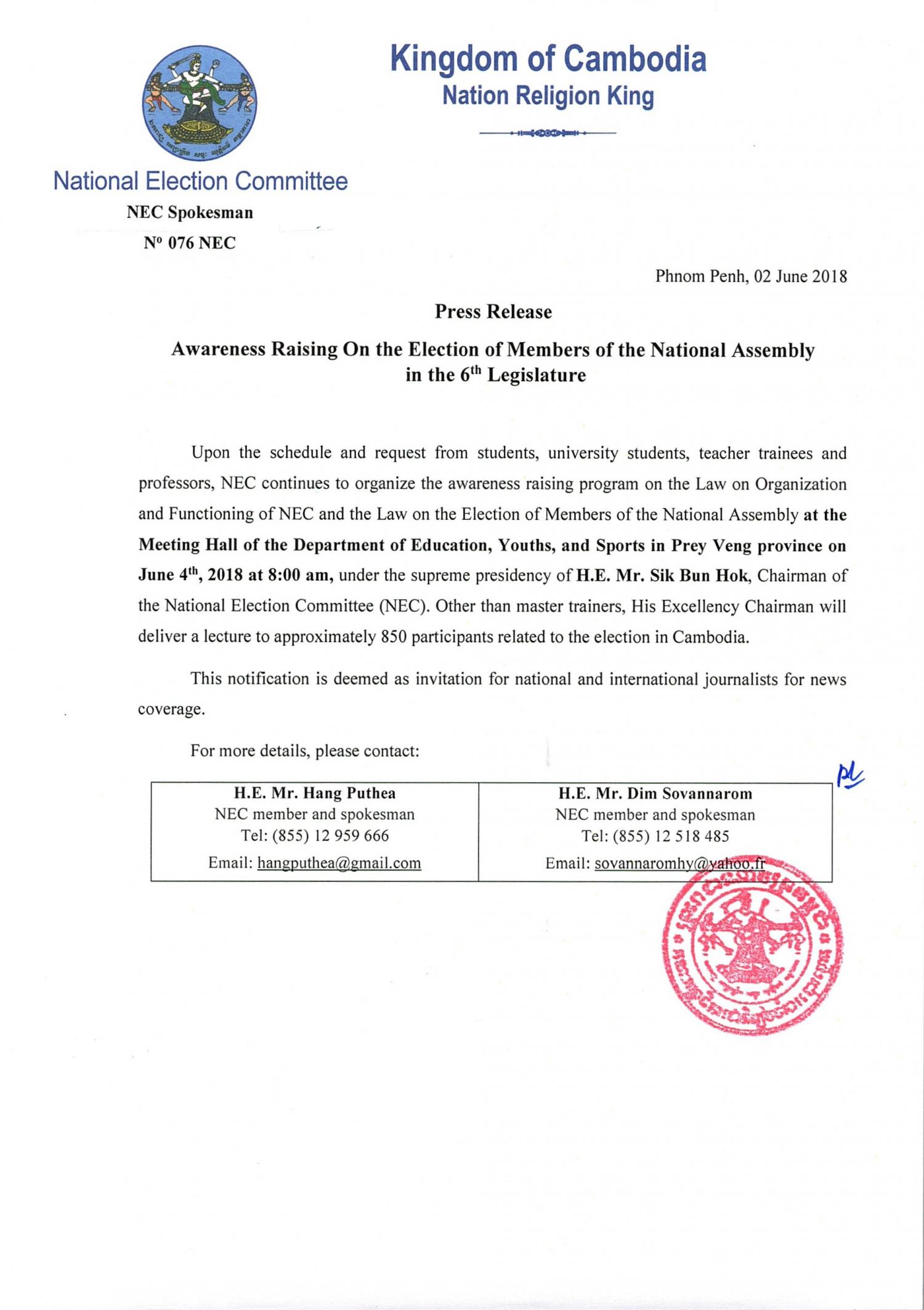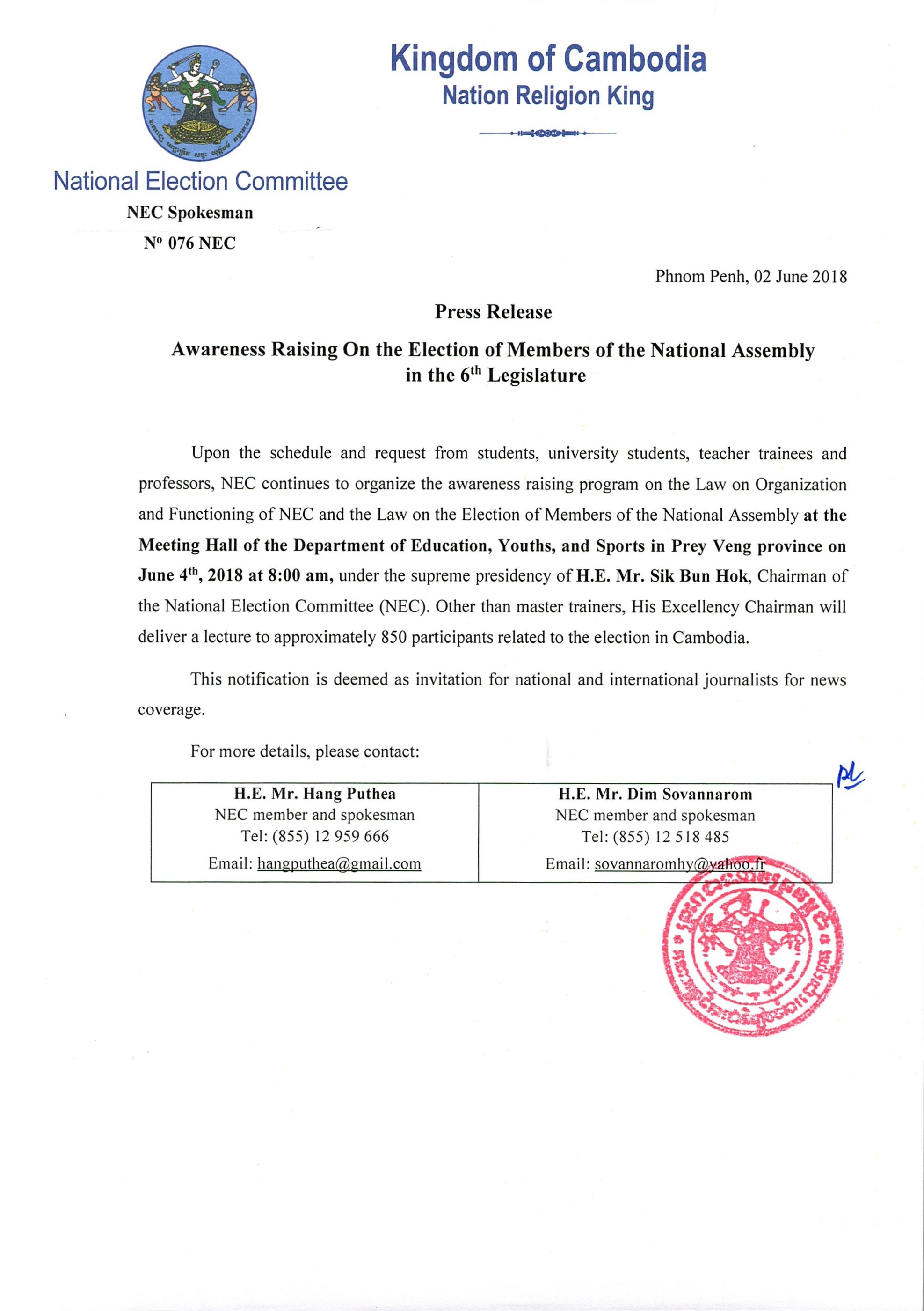 Press Release: Awareness Raising On the Election of Members of the National Assembly in the 6th Legislature