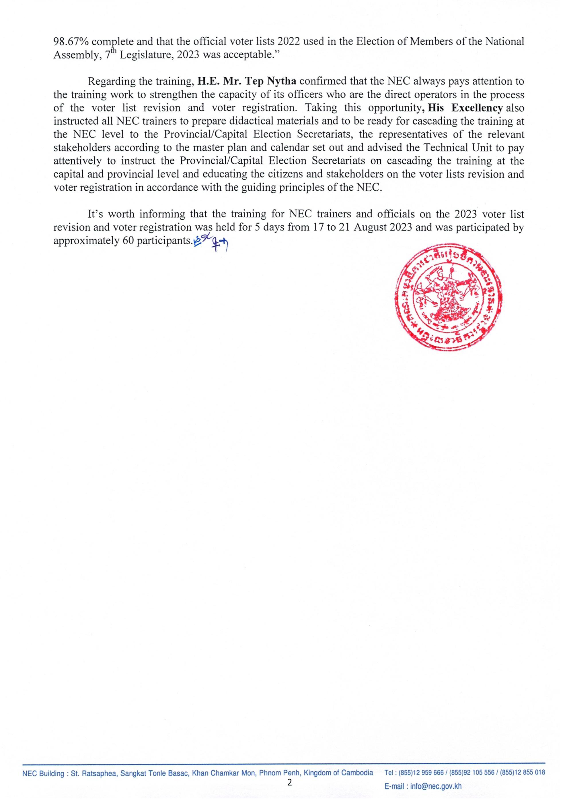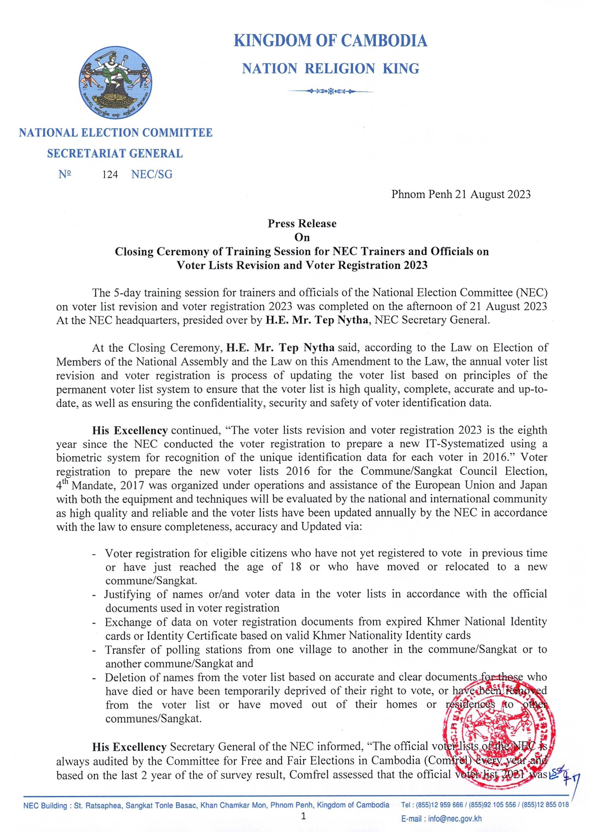 Press Release On Closing Ceremony of Training Session for NEC Trainers and Officials on Voter Lists Revision and Voter Registration 2023