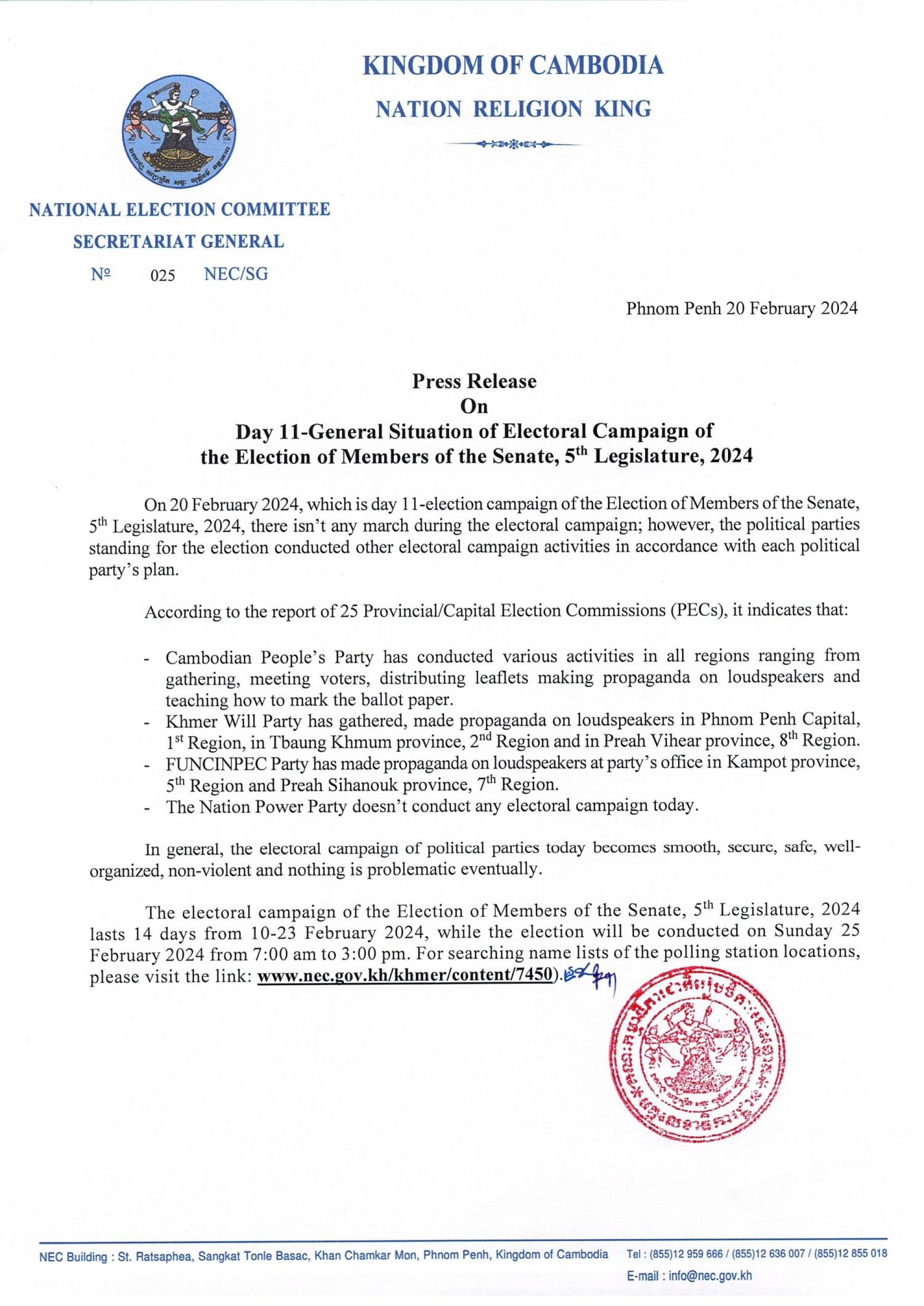 Press Release On Day 11-General Situation of Electoral Campaign of the Election of Members of the Senate, 5th Legislature, 2024