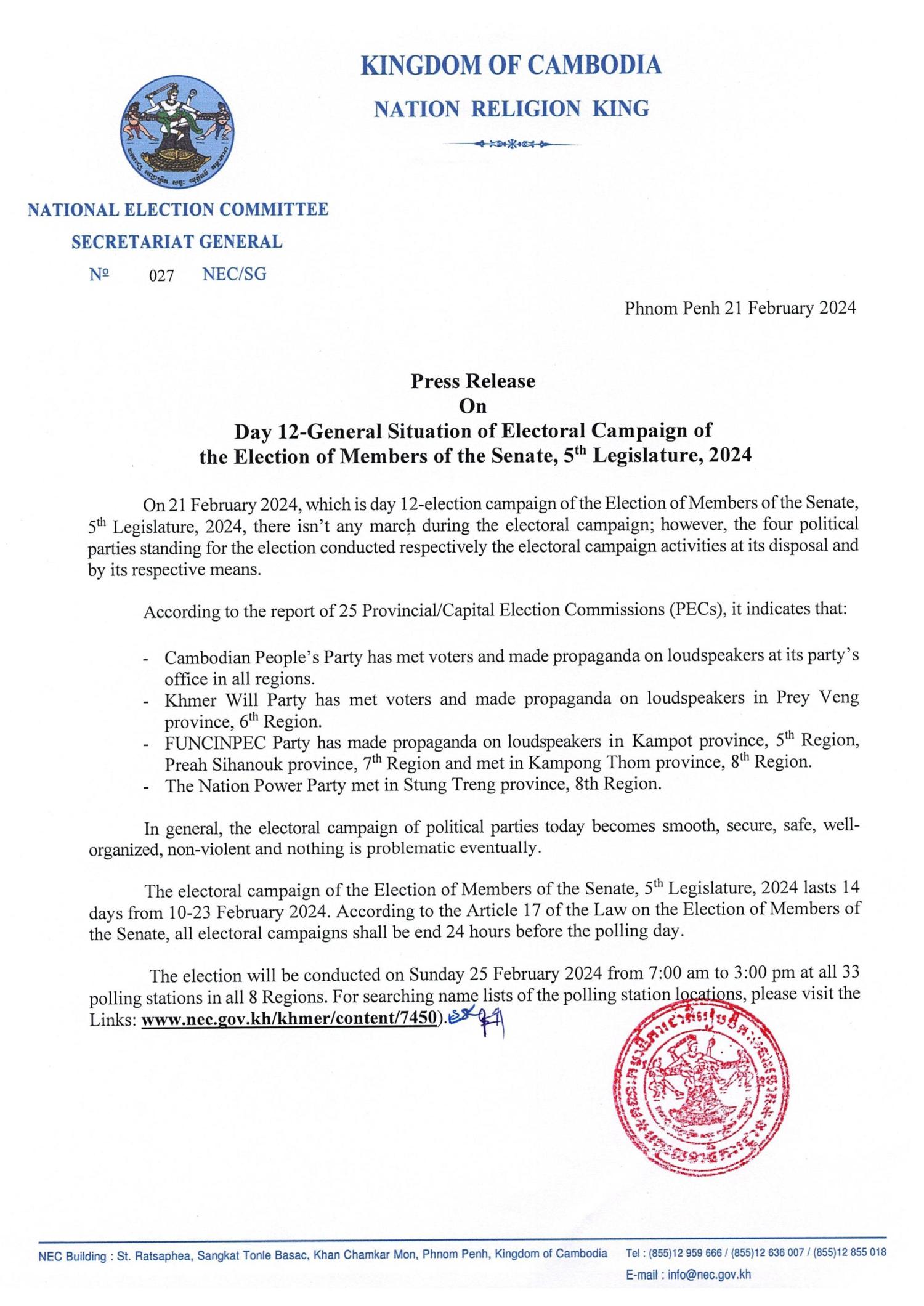 Press Release On Day 12-General Situation of Electoral Campaign of the Election of Members of the Senate, 5th Legislature, 2024