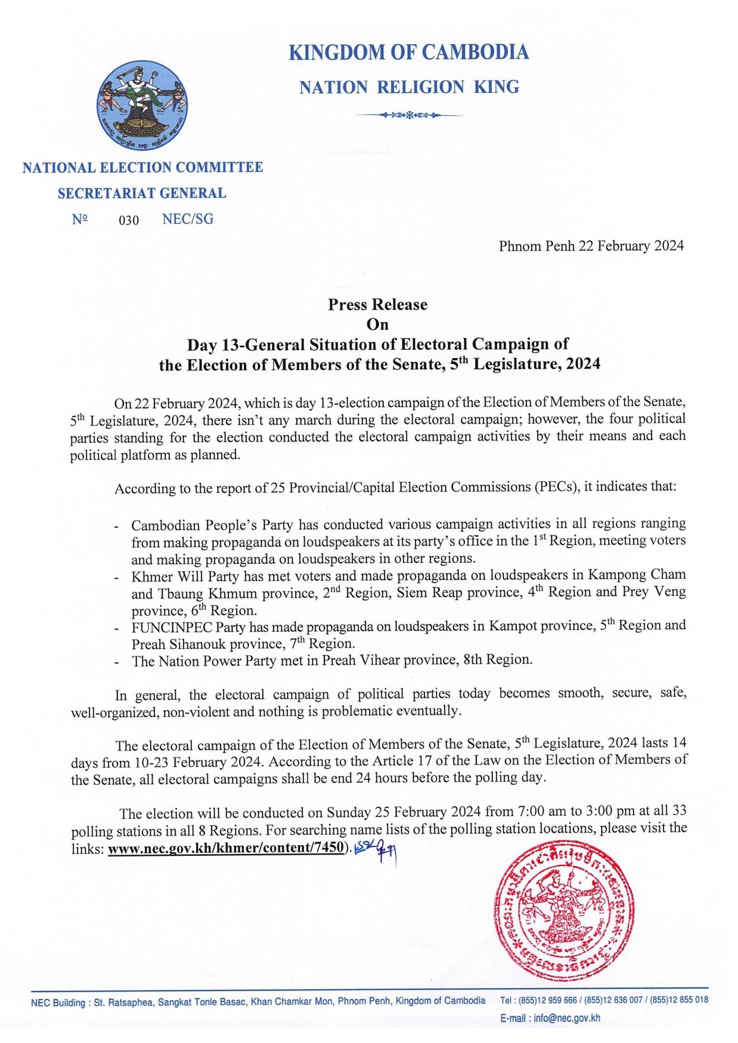 Press Release On Day 13-General Situation of Electoral Campaign of the Election of Members of the Senate, 5th Legislature, 2024
