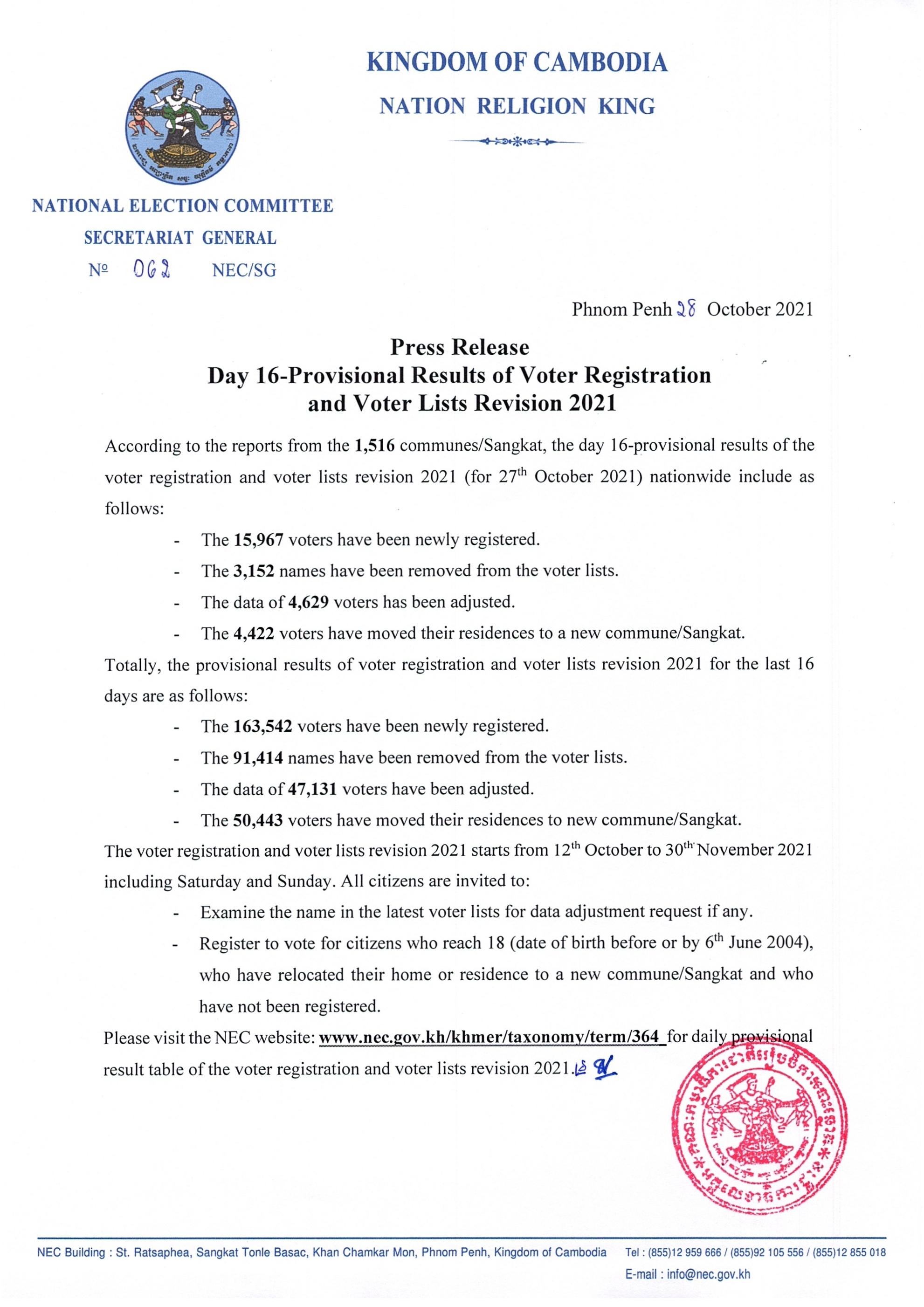 Press Release : Day 16-Provisional Results of Voter Registration and Voter Lists Revision 2021