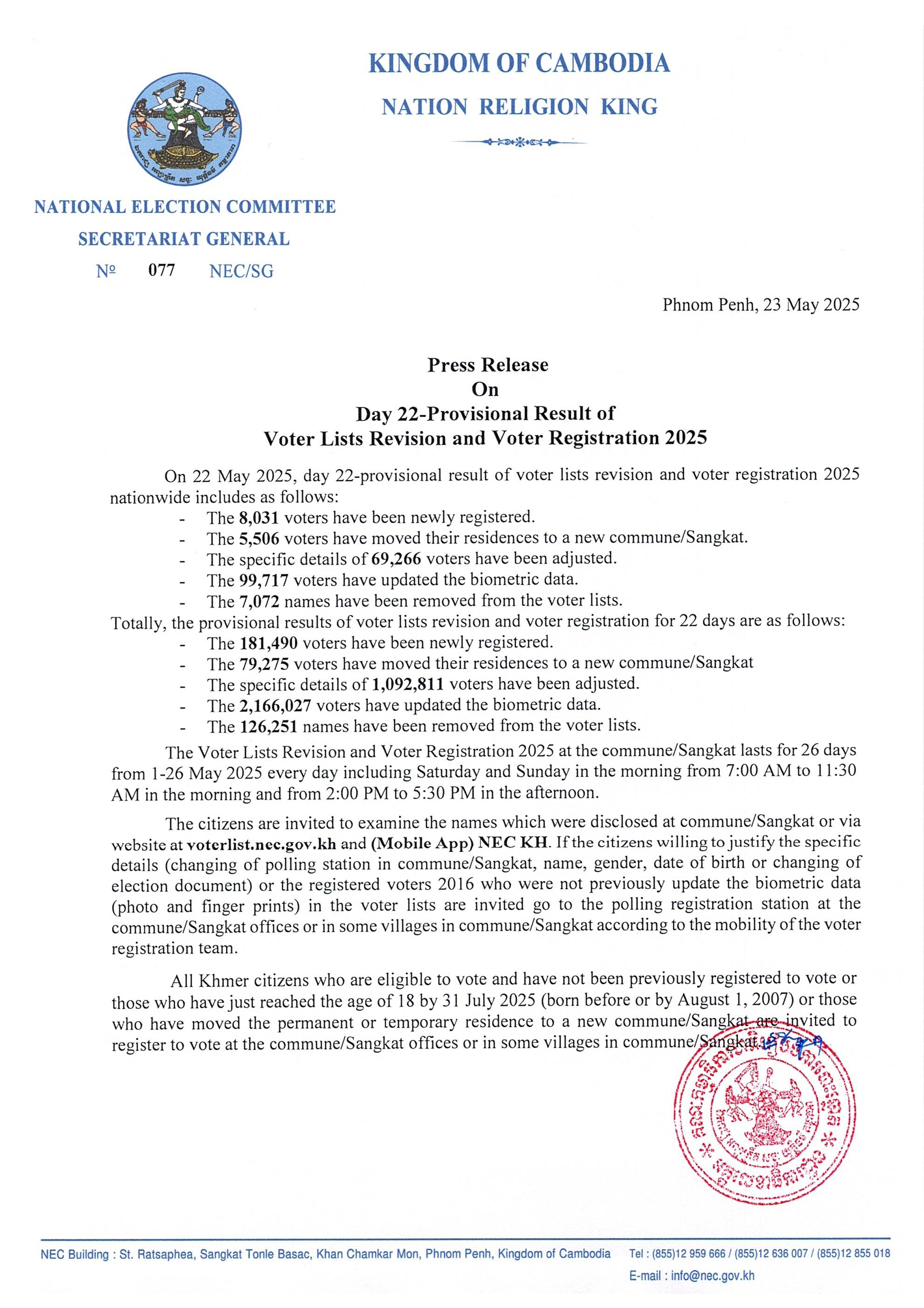 Press Release On Day 22-Provisional Result of Voter Lists Revision and Voter Registration 2025