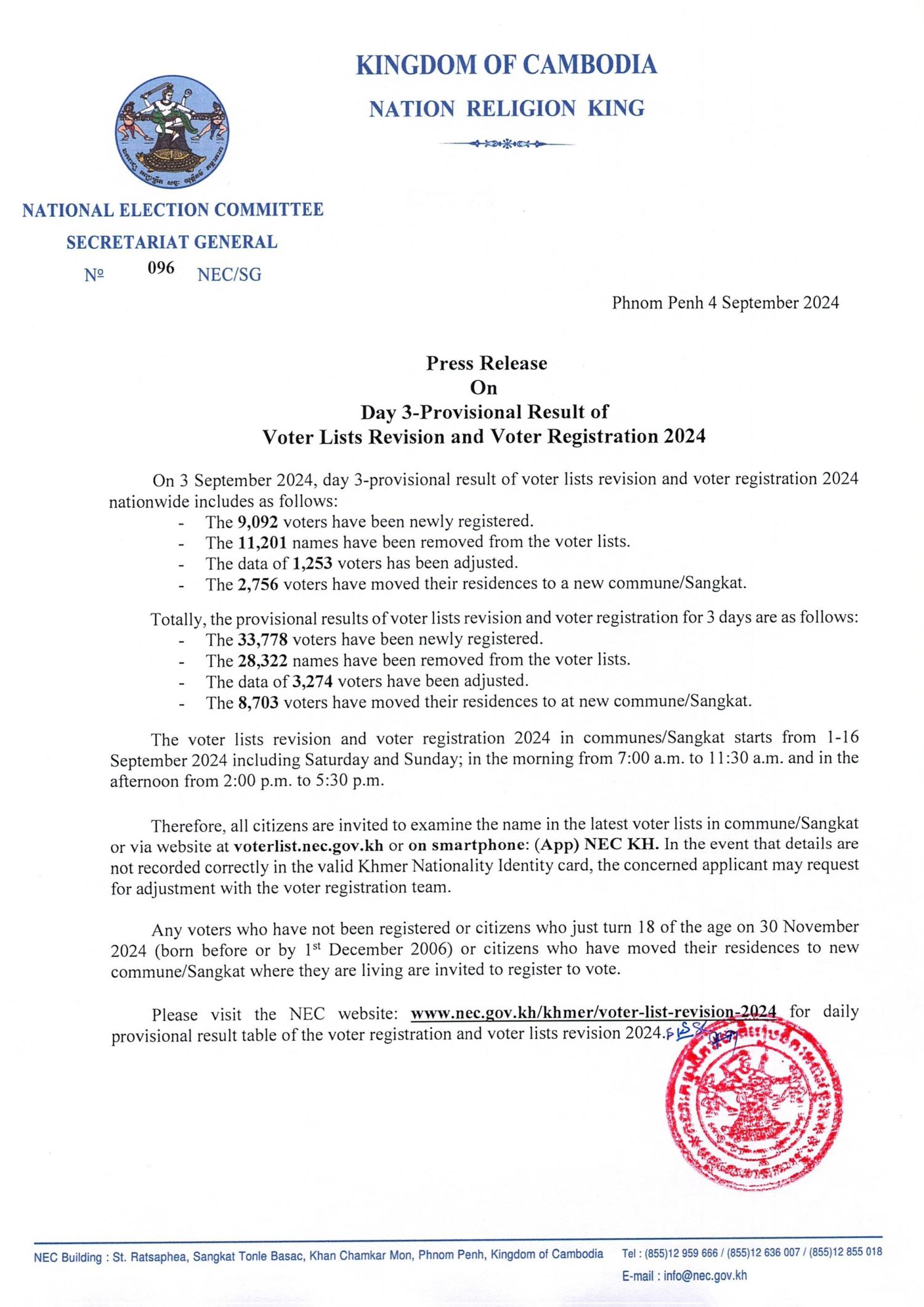 Press Release On Day 3-Provisional Result of Voter Lists Revision and Voter Registration 2024