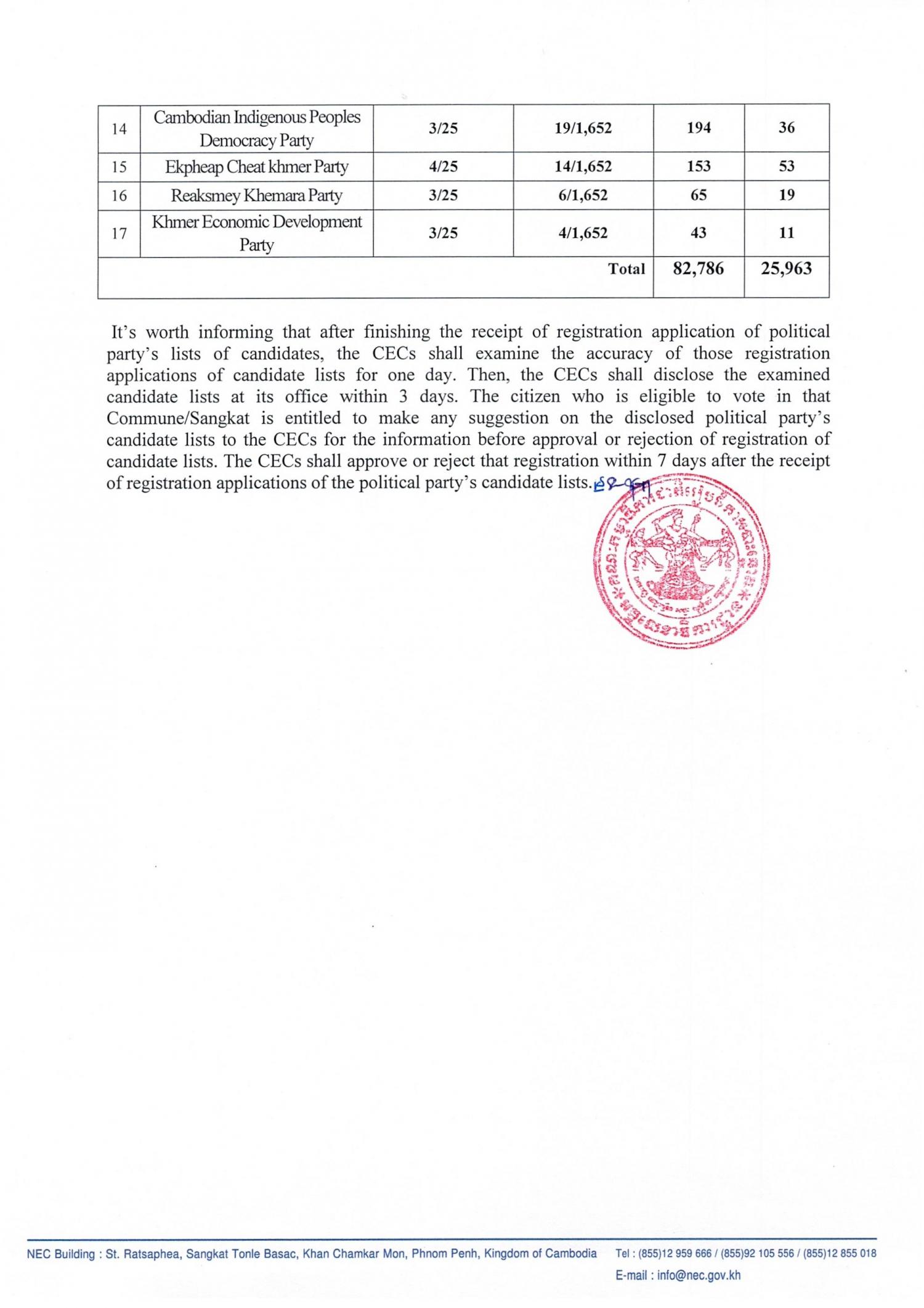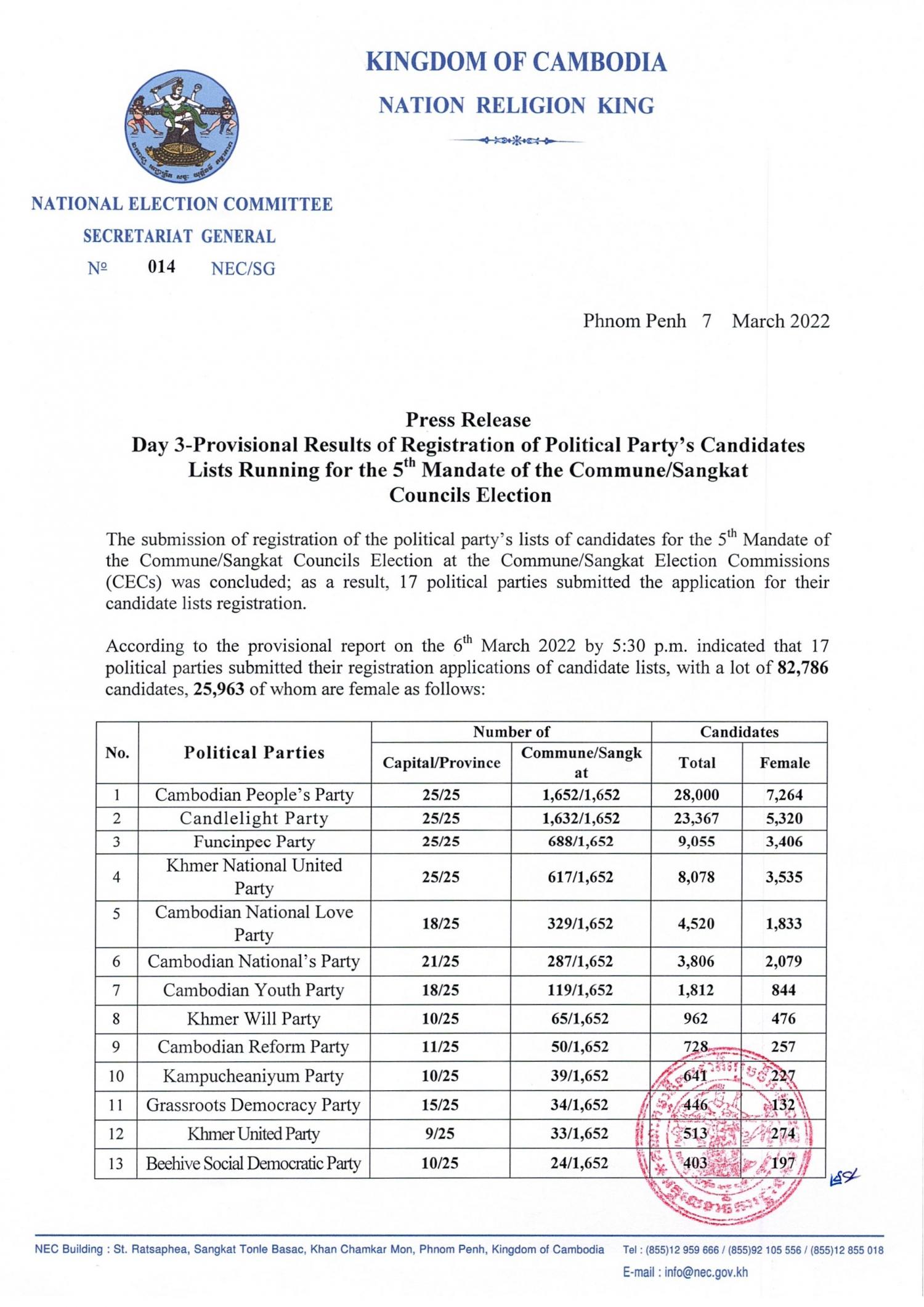 Press Release : Day 3-Provisional Results of Registration of Political Party’s Candidates Lists Running for the 5th Mandate of the Commune/Sangkat Councils Election