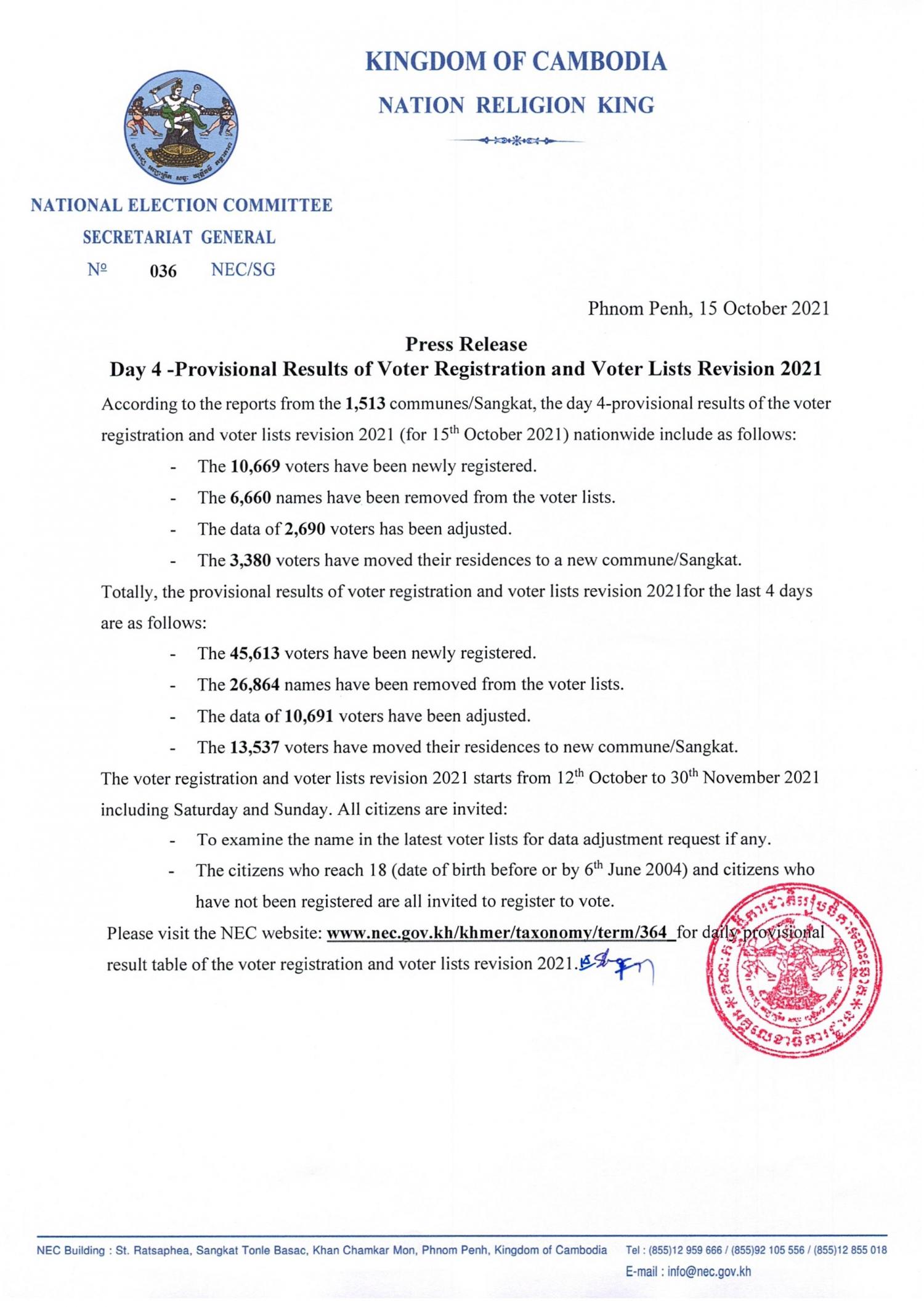 Press Release : Day 4 -Provisional Results of Voter Registration and Voter Lists Revision 2021