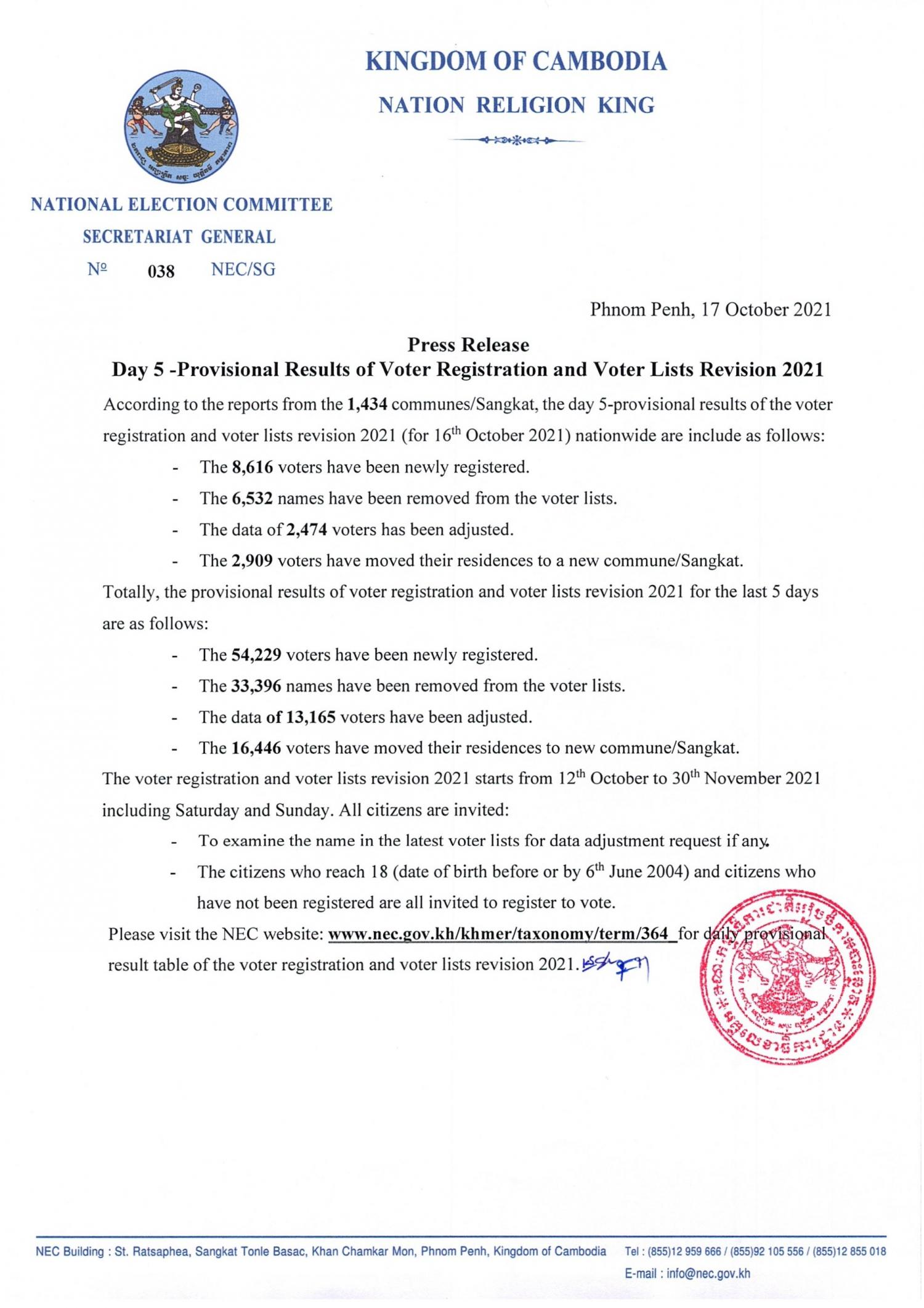 Press Release : Day 5-Provisional Results of Voter Registration and Voter Lists Revision 2021