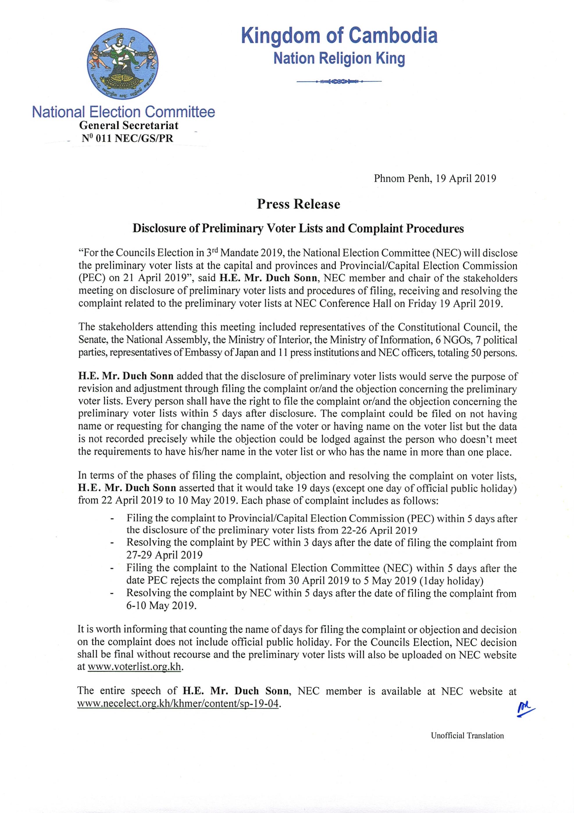 Press Release: Disclosure of Preliminary Voter Lists and Complaint Procedures
