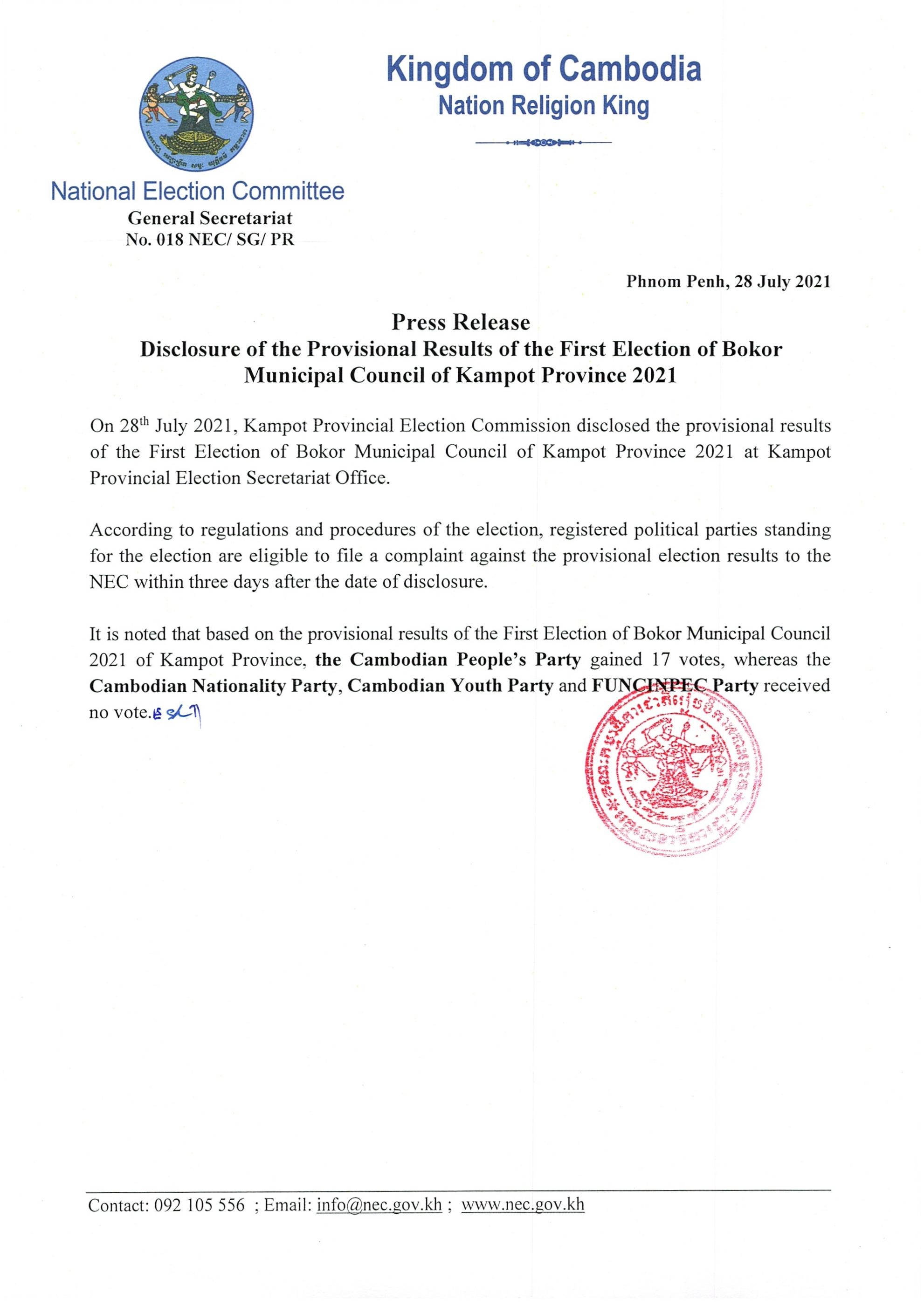 It is noted that based on the provisional results of the First Election of Bokor Municipal Council 2021 of Kampot Province, the Cambodian People’s Party gained 17 votes, whereas the Cambodian Nationality Party, Cambodian Youth Party and FUNCINPEC Party received no vote.