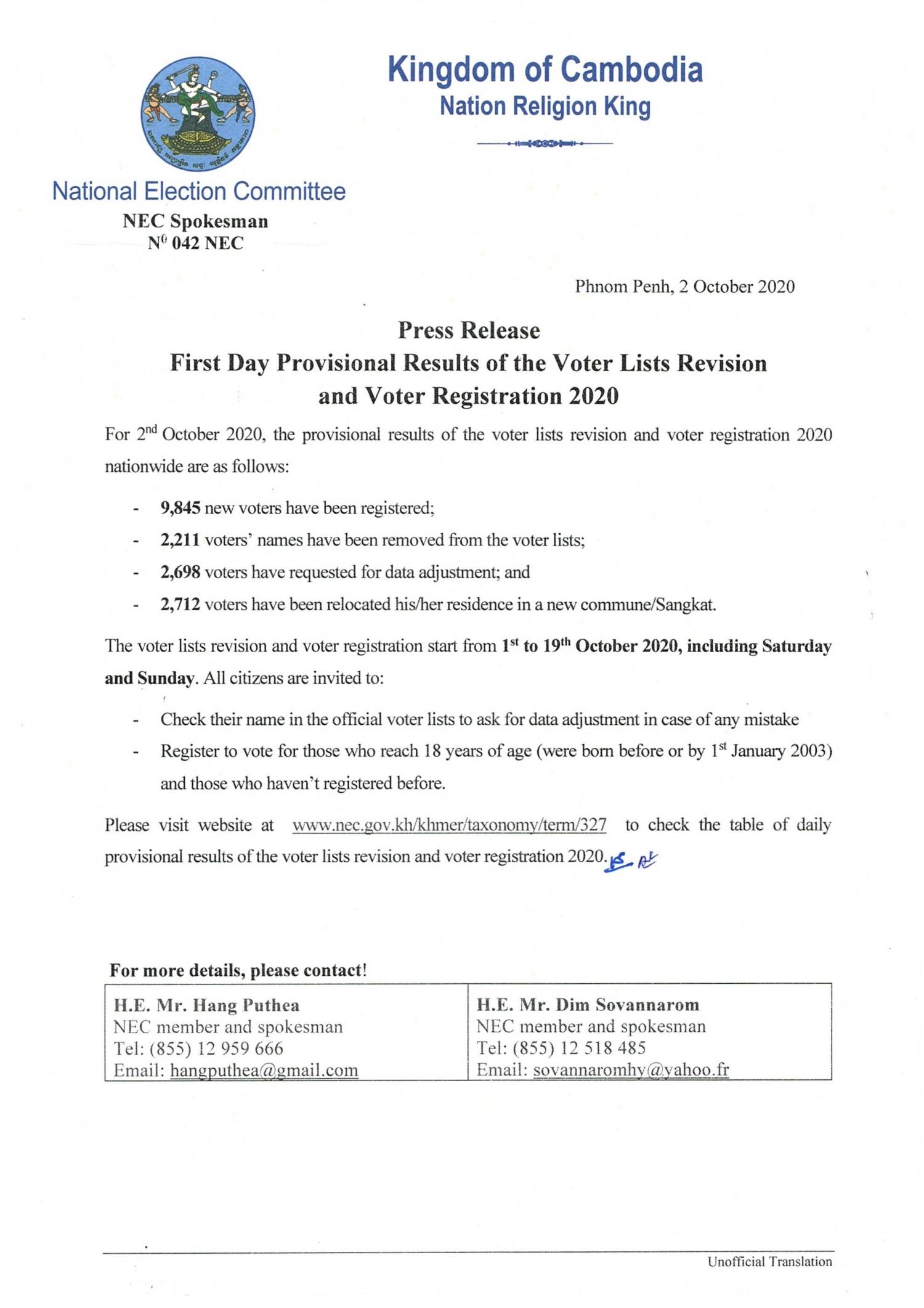 Press Release : First Day Provisional Results of the Voter Lists Revision and Vater Registration 2020