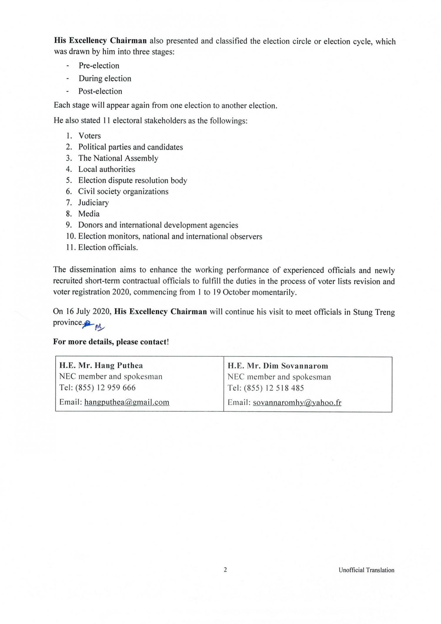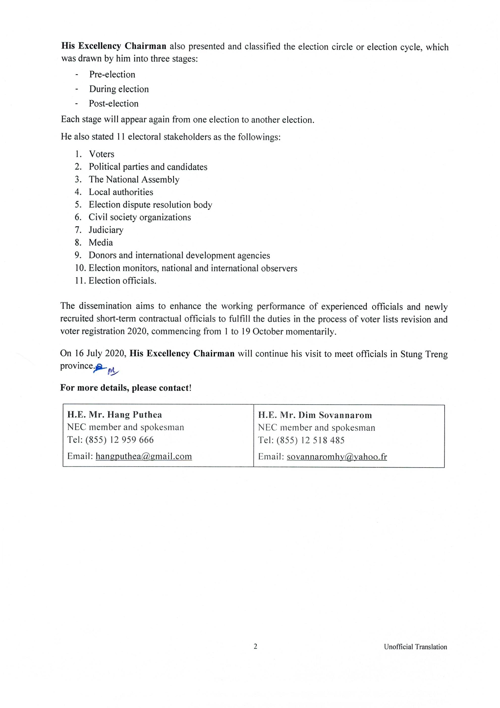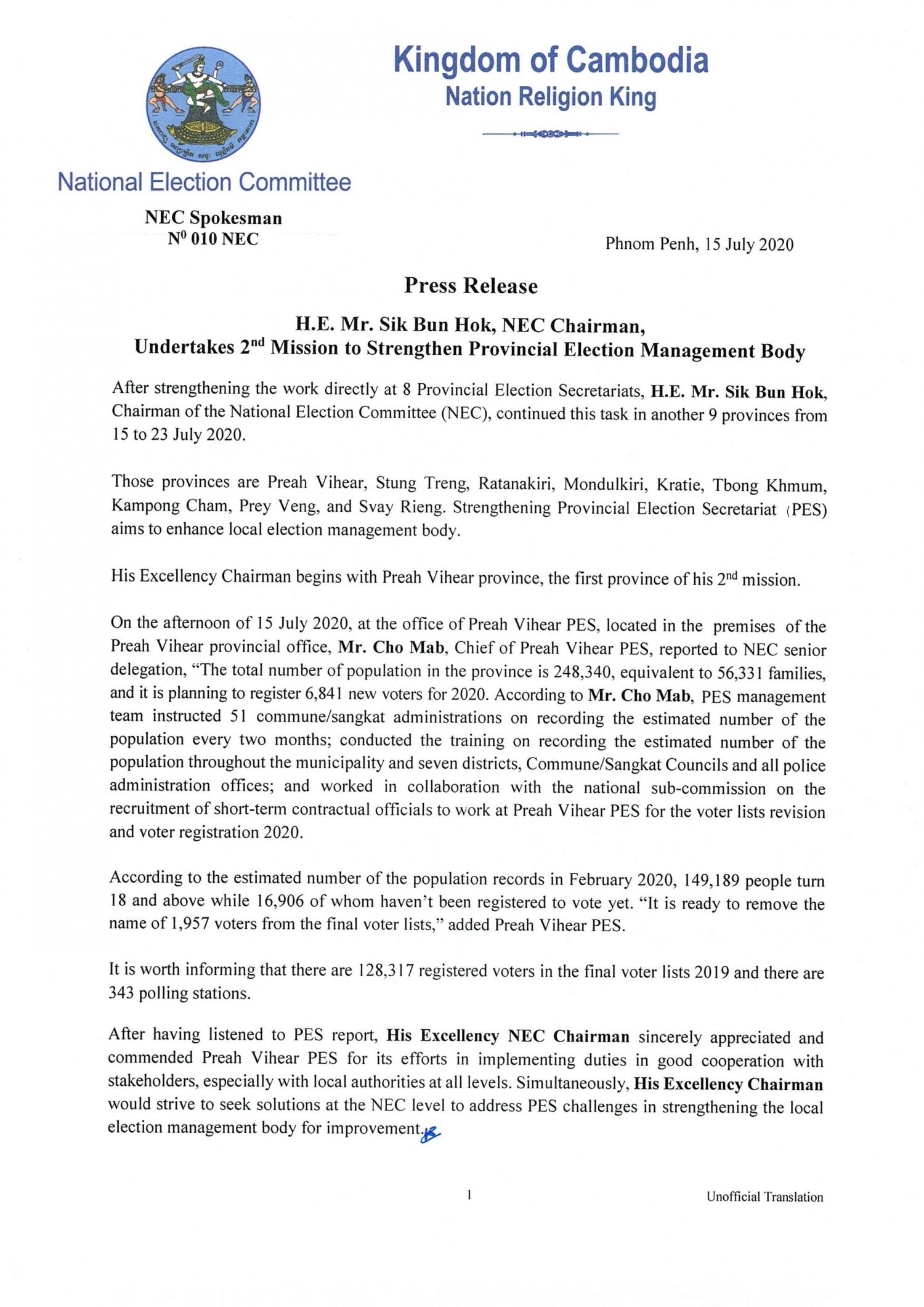 Press Release : H.E Mr. Sik Bun Hok, NEC Chairman, Undertakes 2nd Mission to Strengthen Provincial Election Management Body