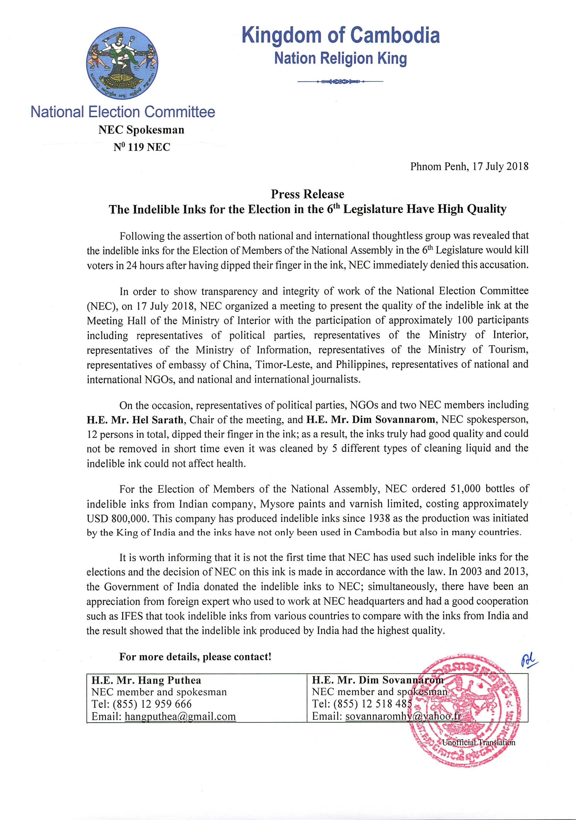 Press Release: The Indelible Inks for the Election in the 6th Legislature Have High Quality