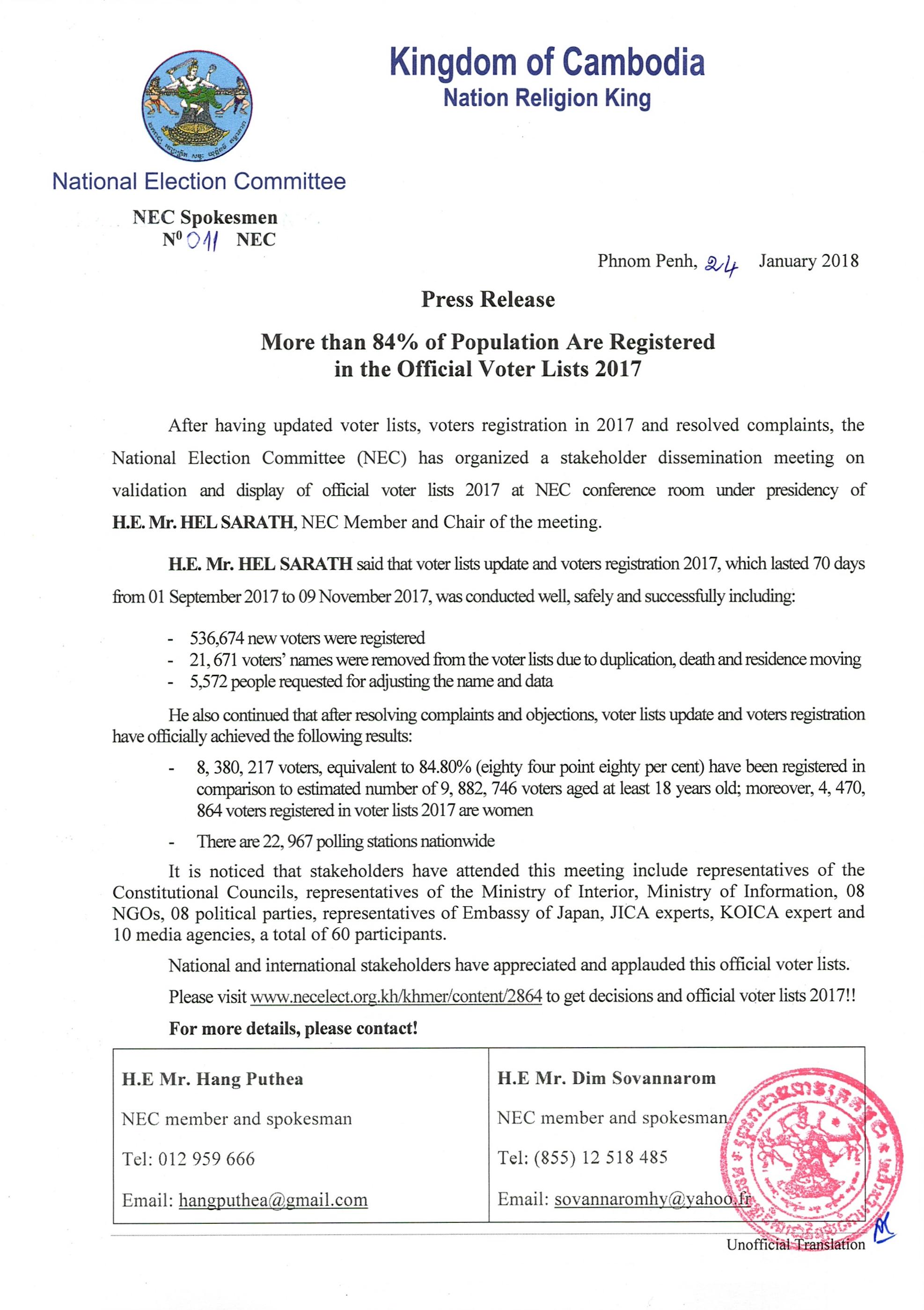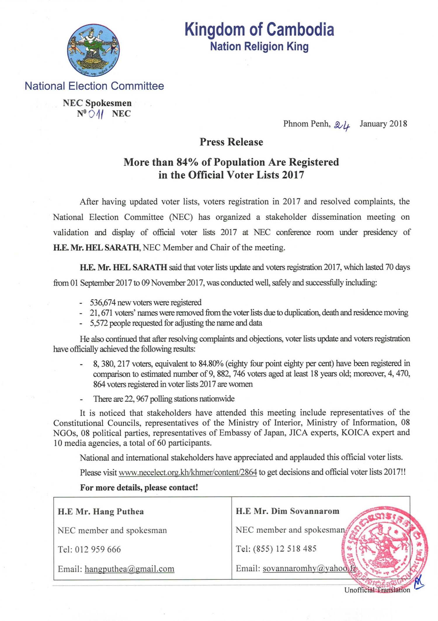 H.E. Mr. HEL SARATH said that voter lists update and voters registration 2017, which lasted 70 days from 01 September 2017 to 09 November 2017, was conducted well, safely and successfully including: