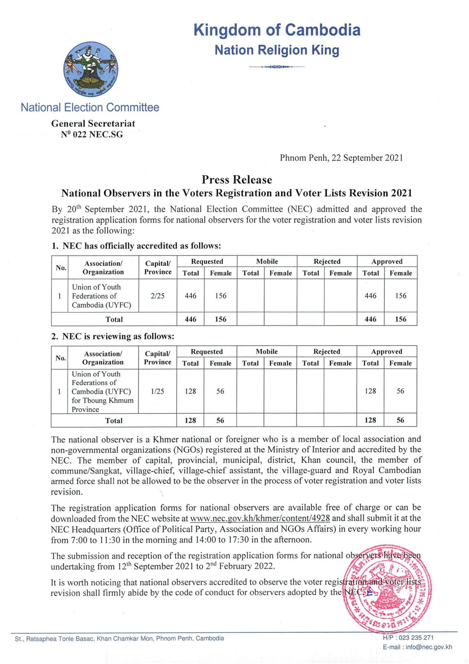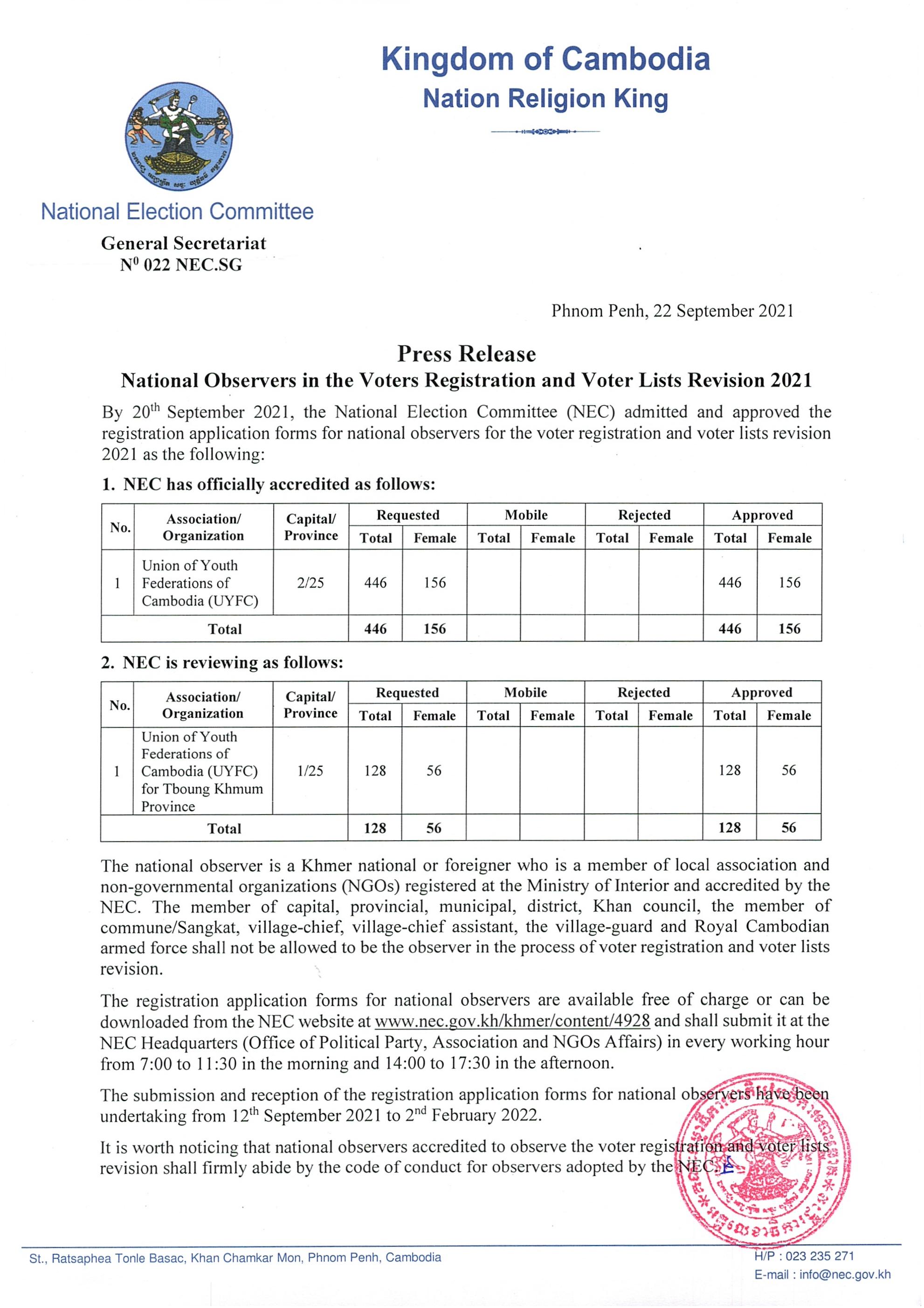 Press Release : National Observers in the Voters Registration and Voter Lists Revision 2021