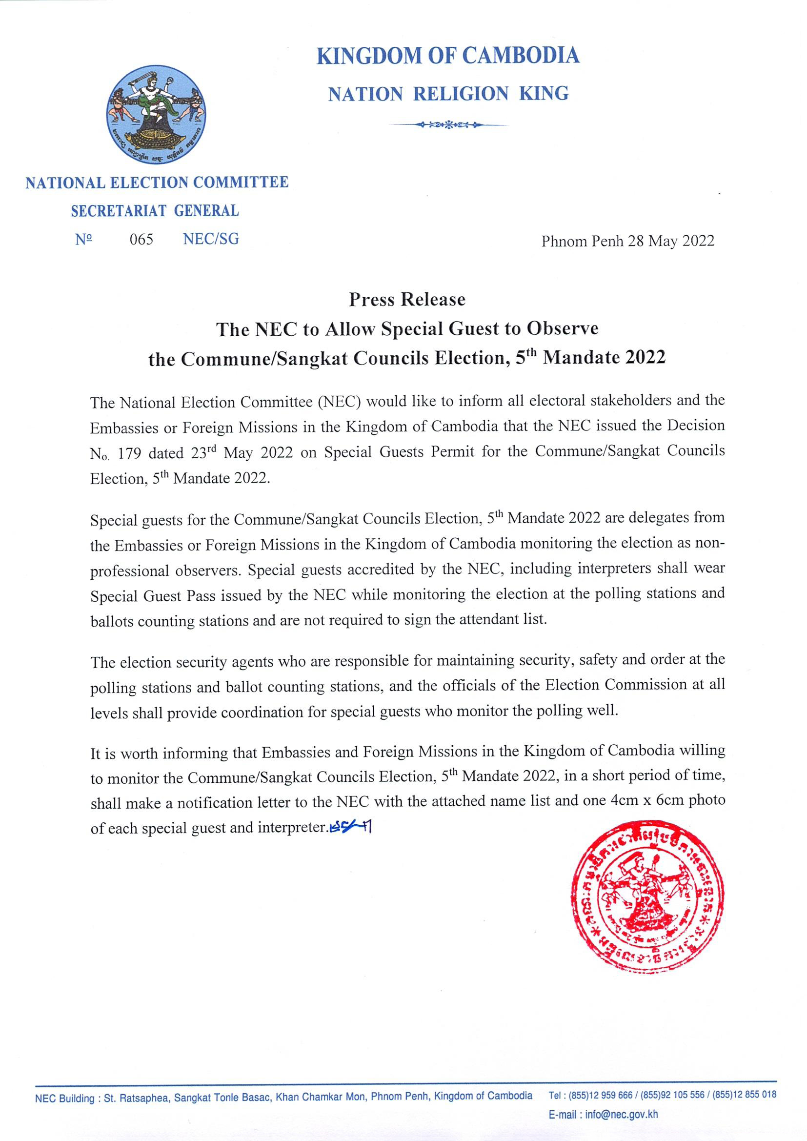 Press Release : The NEC to Allow Special Guest to Observe the Commune/Sangkat Councils Election, 5th Mandate 2022