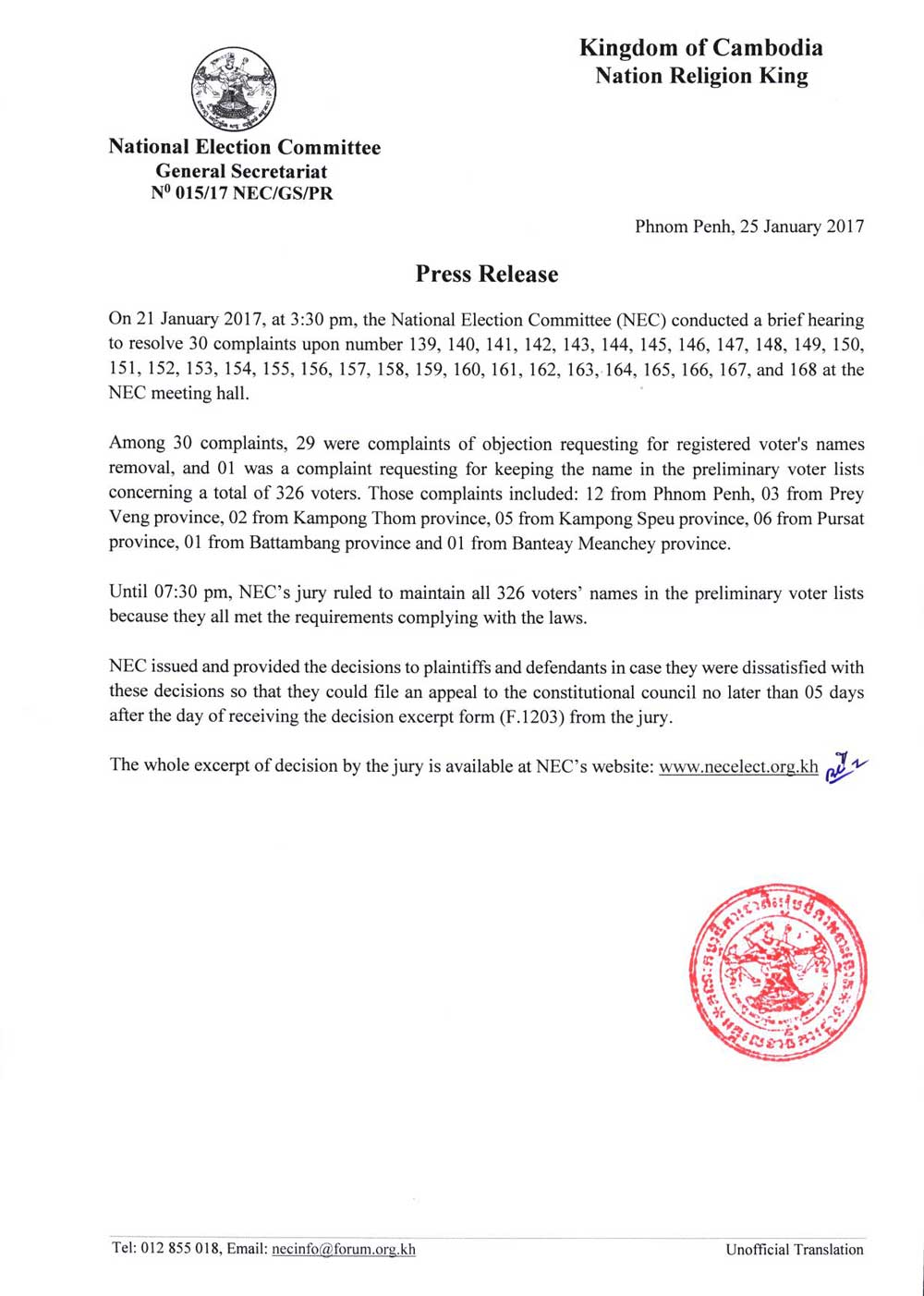 Press Release: NEC conducted a brief hearing to resolve 30 complaints at the NEC meeting hall