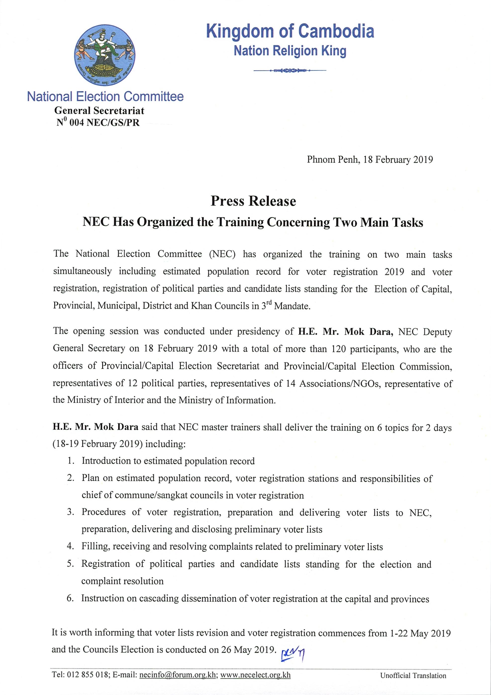 The National Election Committee (NEC) has organized the training on two main tasks simultaneously including estimated population record for voter registration 2019 and voter registration, registration of political parties and candidate lists standing for the Election of Capital, Provincial, Municipal, District and Khan Councils in 3rd Mandate.