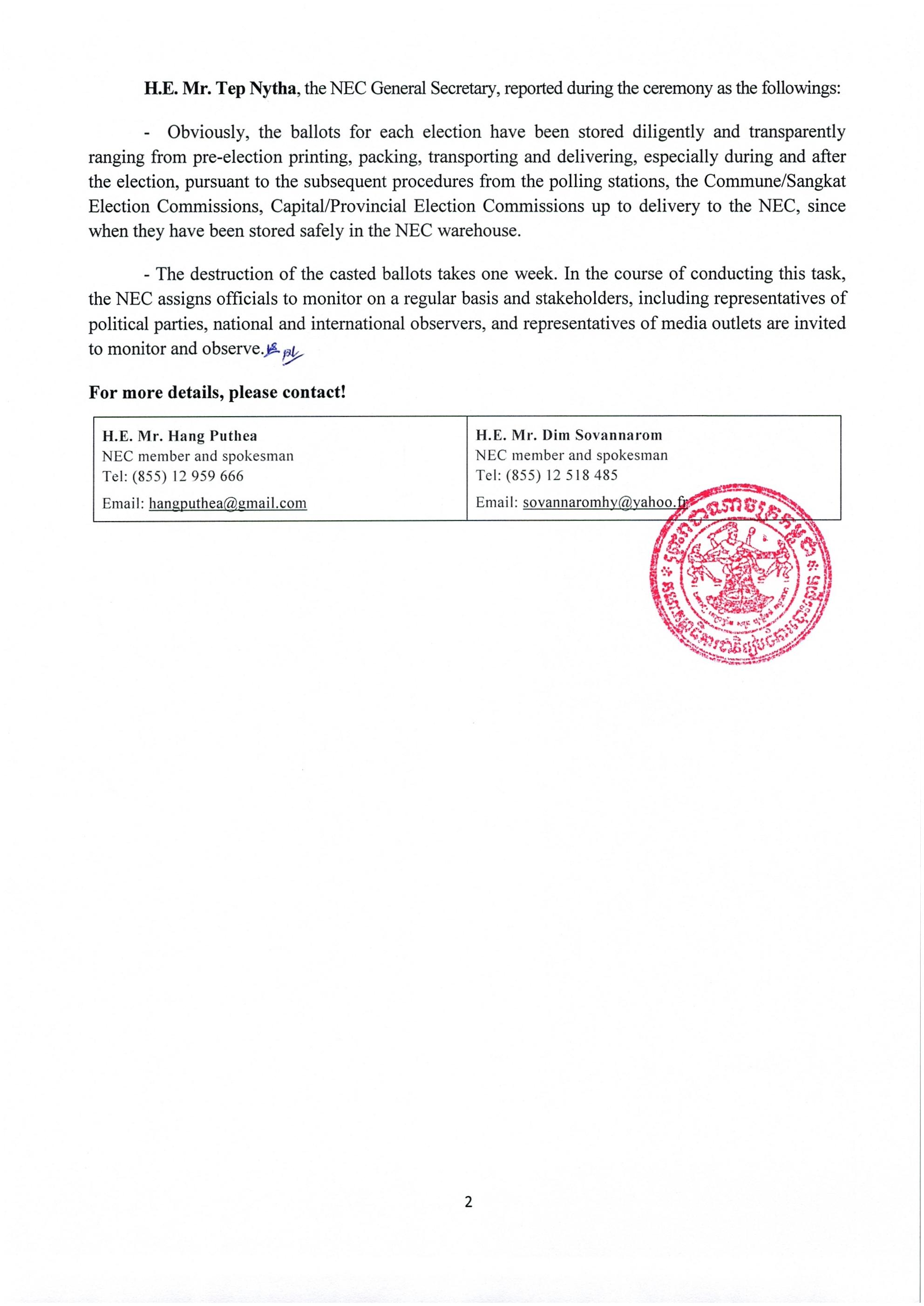 - Obviously, the ballots for each election have been stored diligently and transparently ranging from pre-election printing, packing, transporting and delivering, especially during and after the election, pursuant to the subsequent procedures from the polling stations, the Commune/Sangkat Election Commissions, Capital/Provincial Election Commissions up to delivery to the NEC, since when they have been stored safely in the NEC warehouse.