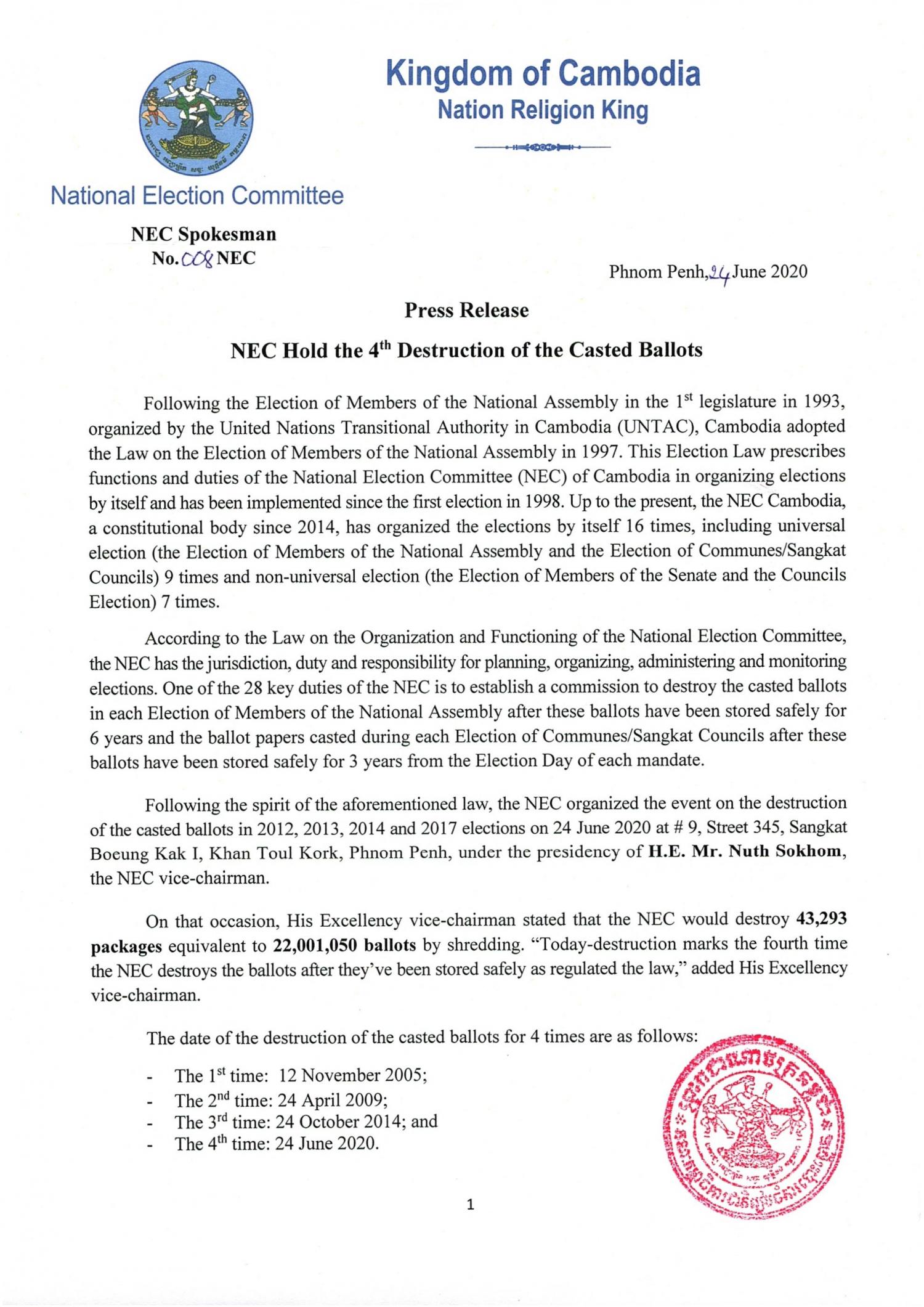 Following the spirit of the aforementioned law, the NEC organized the event on the destruction of the casted ballots in 2012, 2013, 2014 and 2017 elections on 24 June 2020 at # 9, Street 345, Sangkat Boeung Kak I, Khan Toul Kork, Phnom Penh, under the presidency of H.E. Mr. Nuth Sokhom, the NEC vice-chairman.