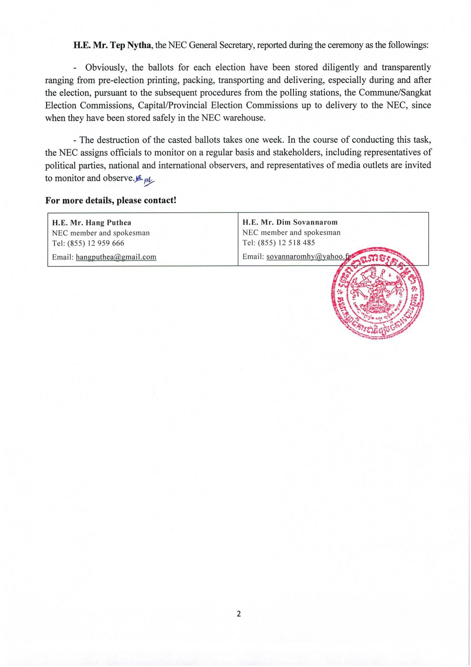 According to the Law on the Organization and Functioning of the National Election Committee, the NEC has the jurisdiction, duty and responsibility for planning, organizing, administering and monitoring elections. One of the 28 key duties of the NEC is to establish a commission to destroy the casted ballots in each Election of Members of the National Assembly after these ballots have been stored safely for 6 years and the ballot papers casted during each Election of Communes/Sangkat Councils after these ballots have been stored safely for 3 years from the Election Day of each mandate.