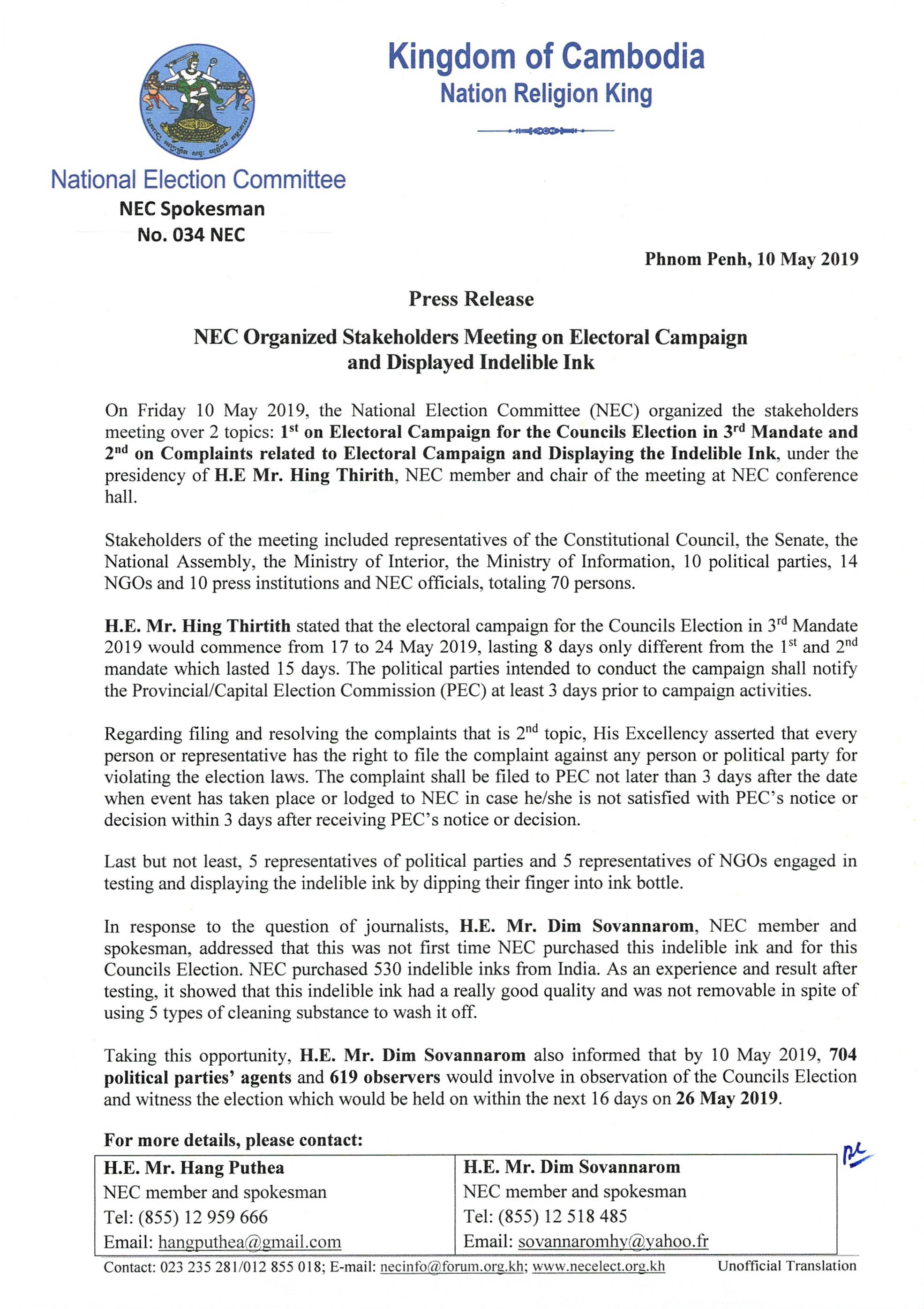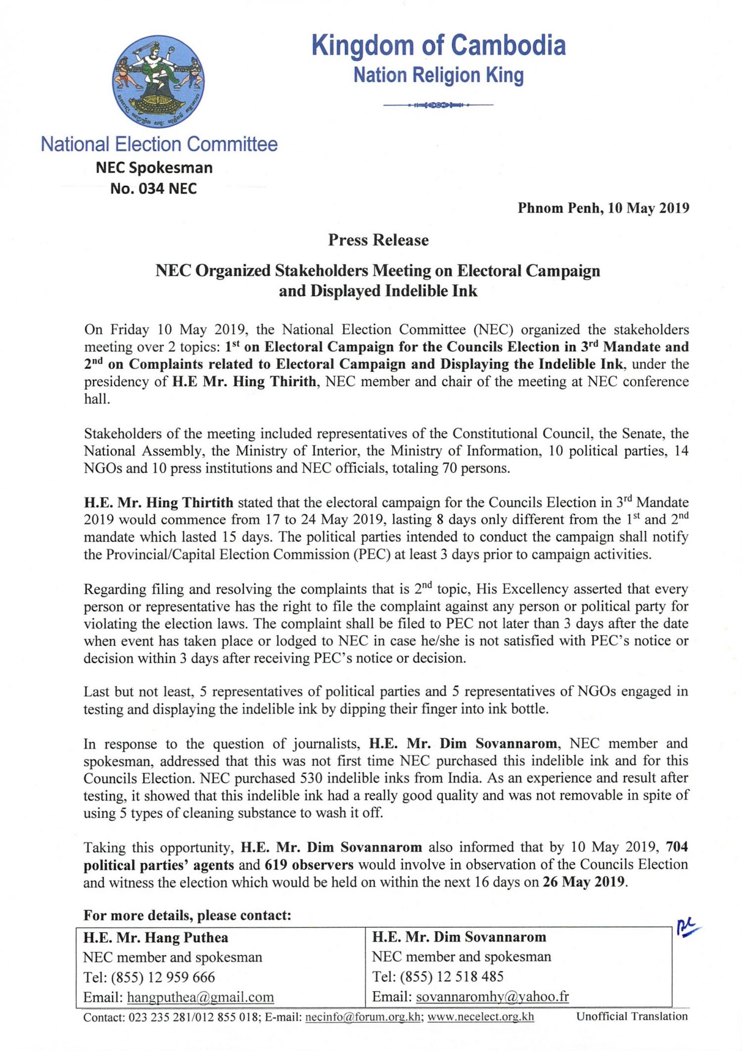 Press Release: NEC Organized Stakeholders Meeting on Electoral Campaign and Displayed Indelible Ink
