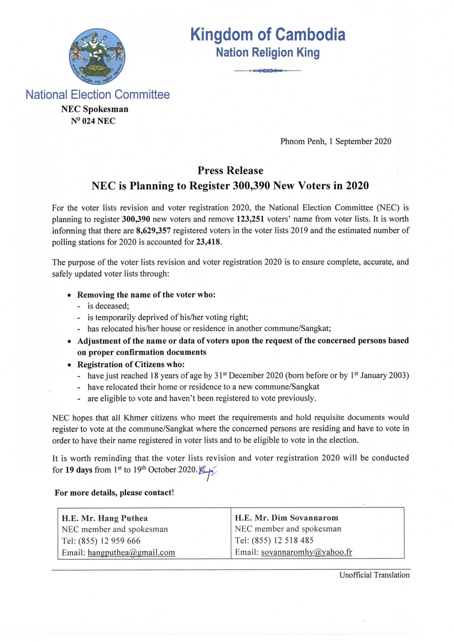 Press Release : NEC is Planning to Register 300,390 New Voters in 2020