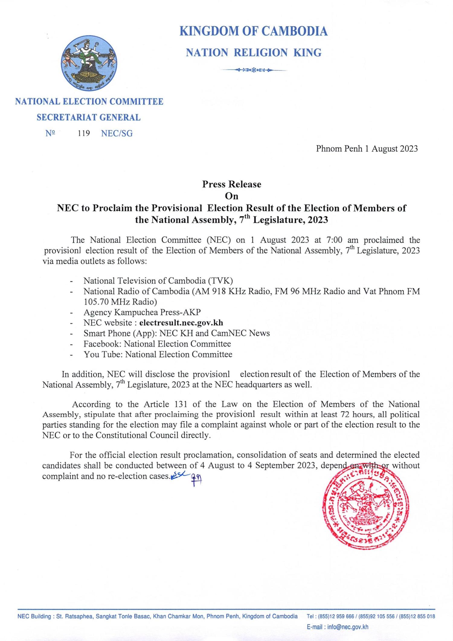 Press Release On NEC to Proclaim the Provisional Election Result of the Election of Members of the National Assembly, 7th Legislature, 2023