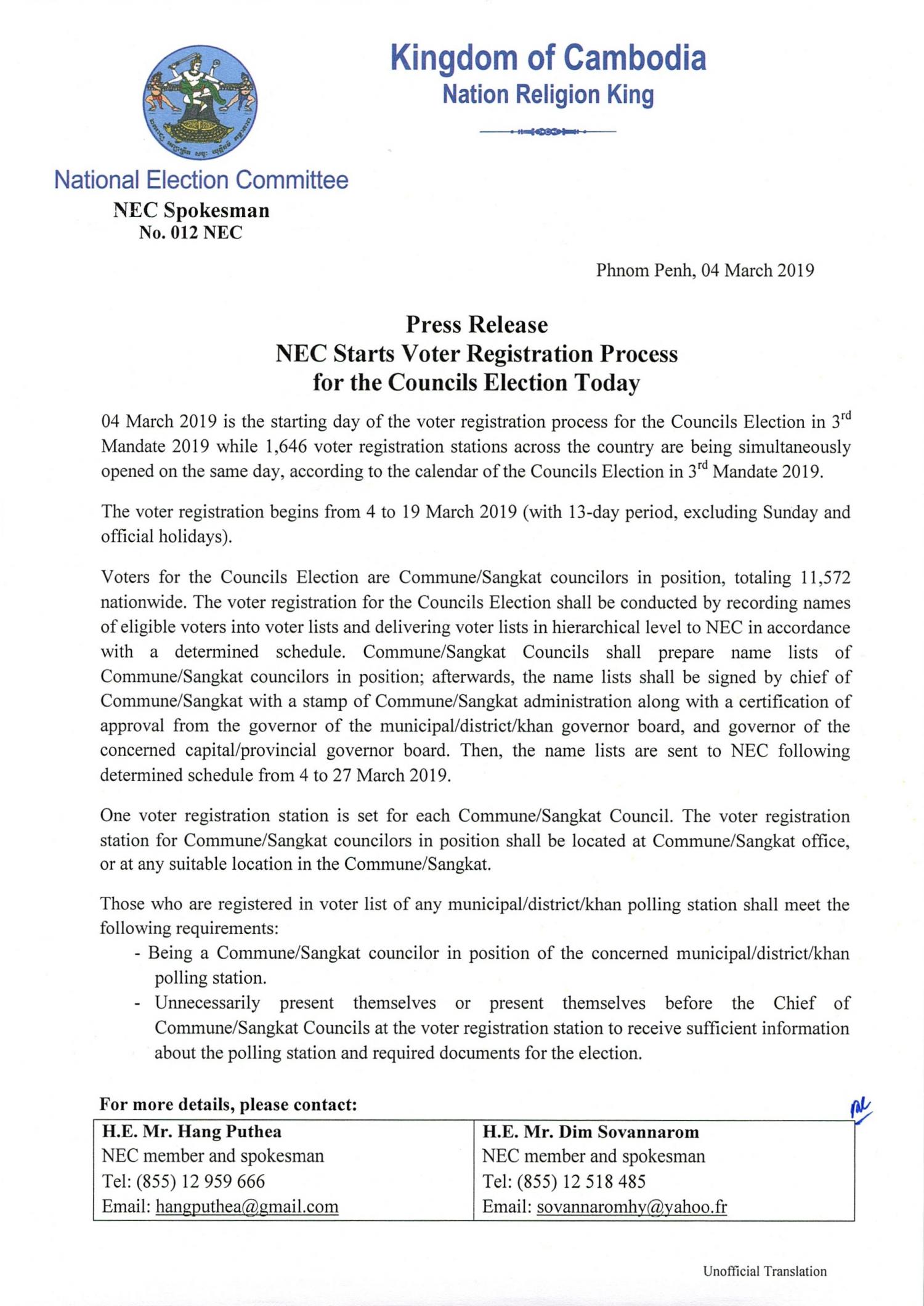 Voters for the Councils Election are Commune/Sangkat councilors in position, totaling 11,572 nationwide. The voter registration for the Councils Election shall be conducted by recording names of eligible voters into voter lists and delivering voter lists in hierarchical level to NEC in accordance with a determined schedule. Commune/Sangkat Councils shall prepare name lists of Commune/Sangkat councilors in position; afterwards, the name lists shall be signed by chief of Commune/Sangkat with a stamp of Commune/Sangkat administration along with a certification of approval from the governor of the municipal/district/khan governor board, and governor of the concerned capital/provincial governor board. Then, the name lists are sent to NEC following determined schedule from 4 to 27 March 2019.