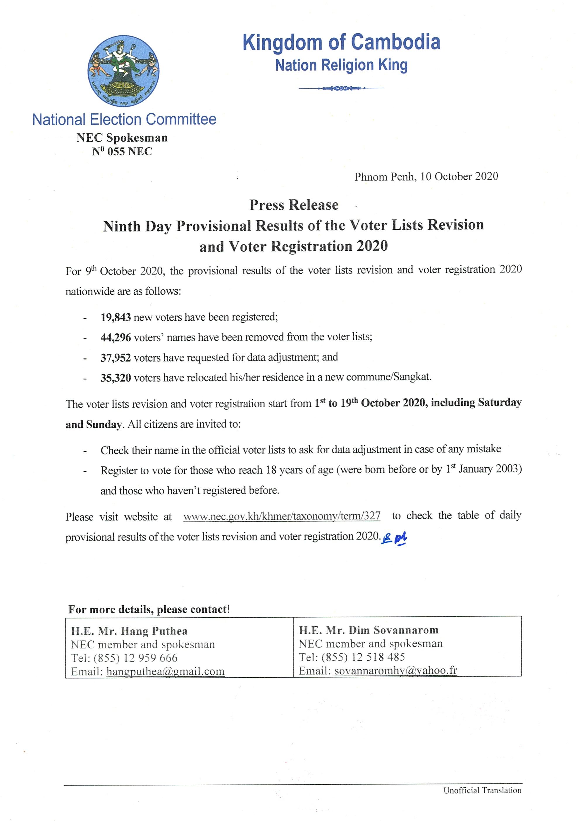 Press Release : Ninth Day Provisional Results of the Voter Lists Revision and Voter Registration 2020