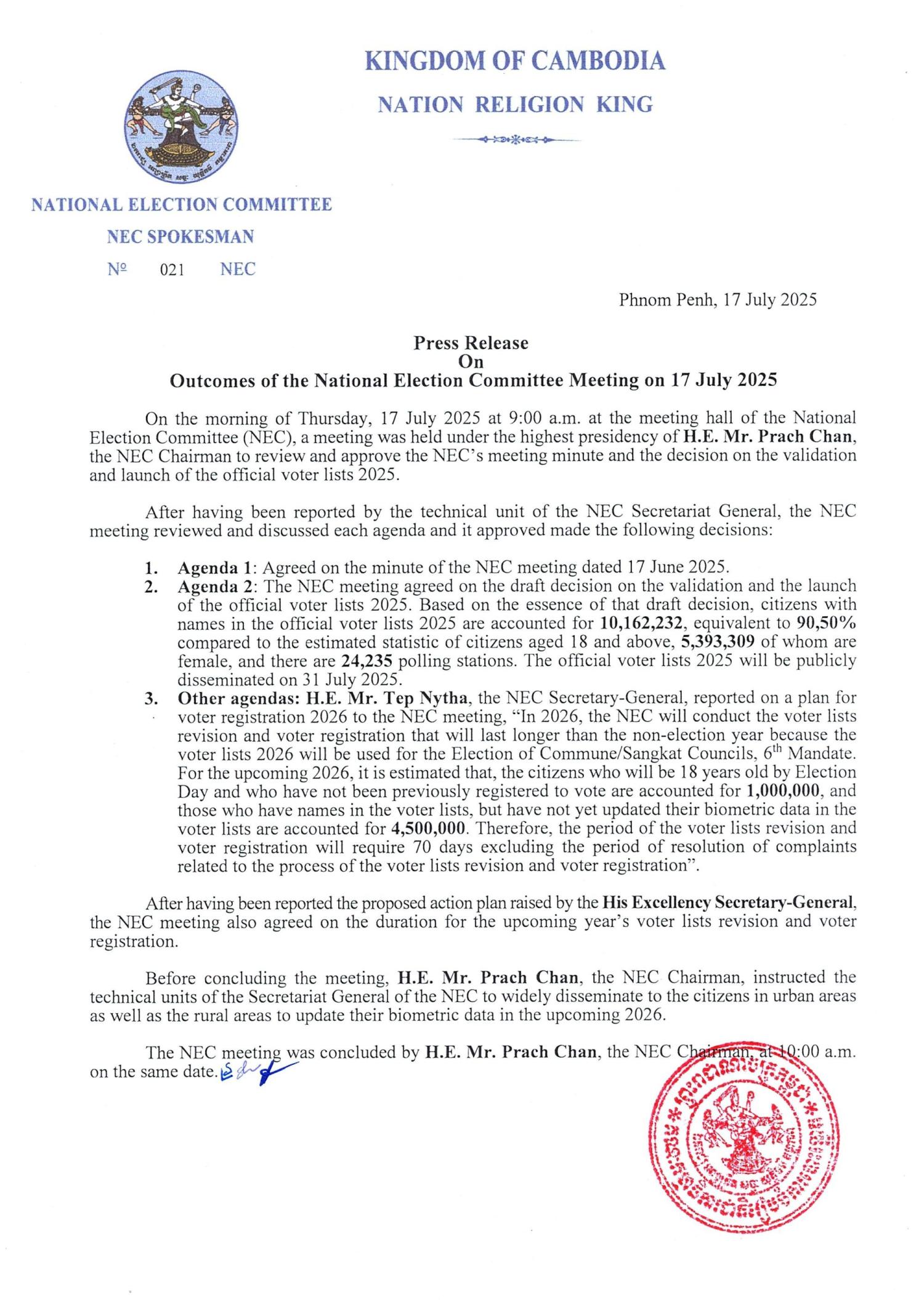 Press Release On Outcomes of the National Election Committee Meeting on 17 July 2025