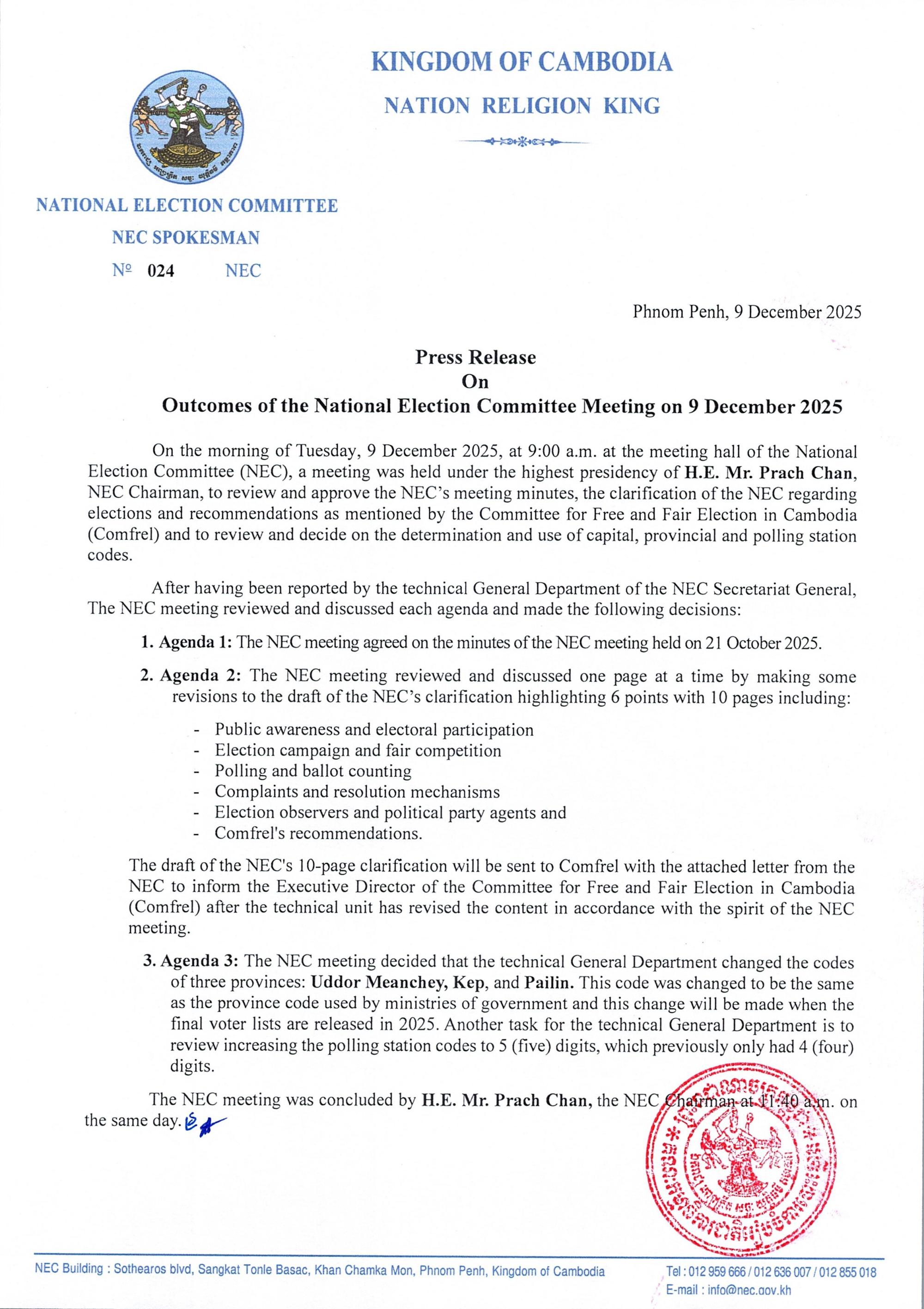 Press Release On Outcomes of the National Election Committee Meeting on 9 December 2025