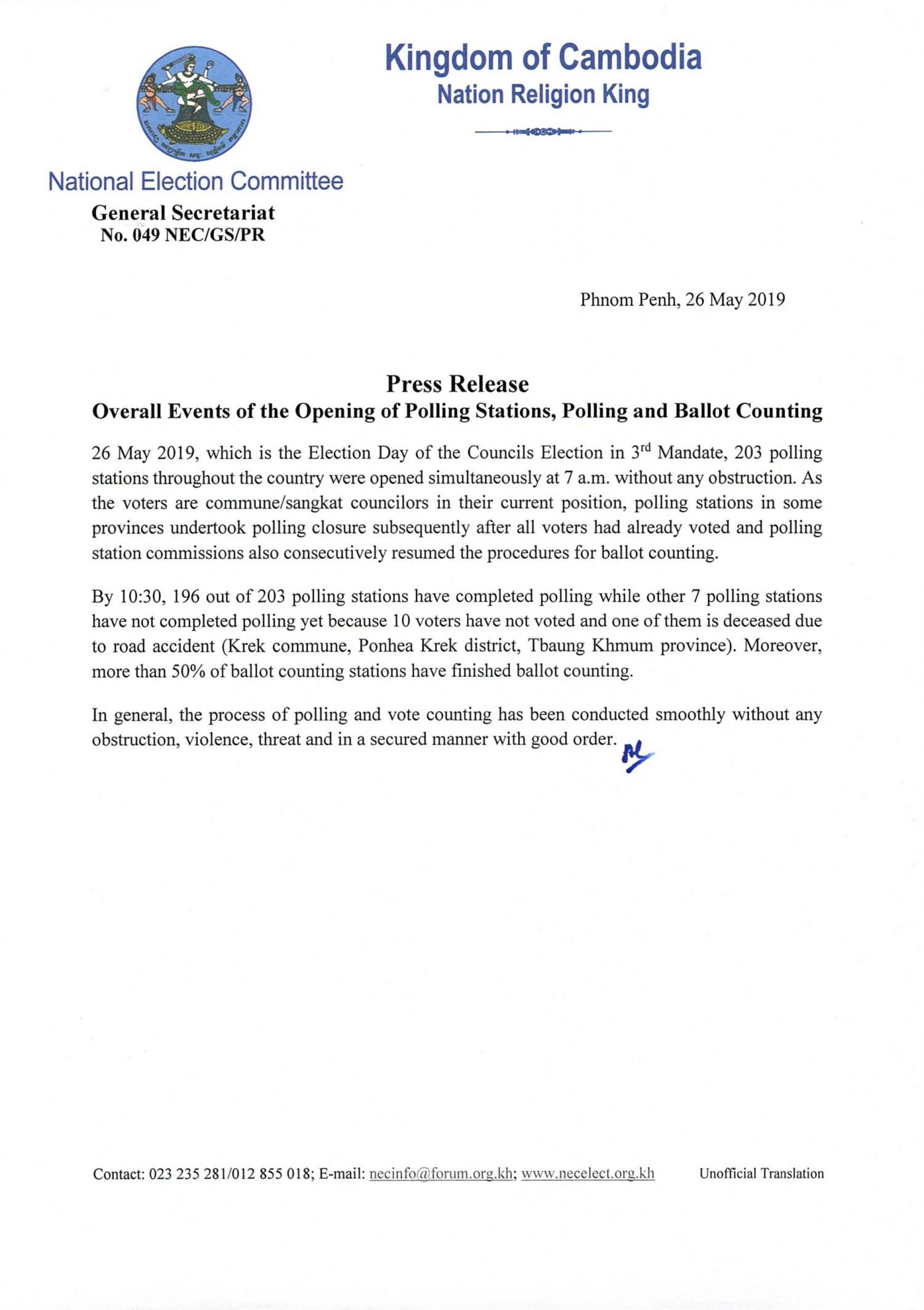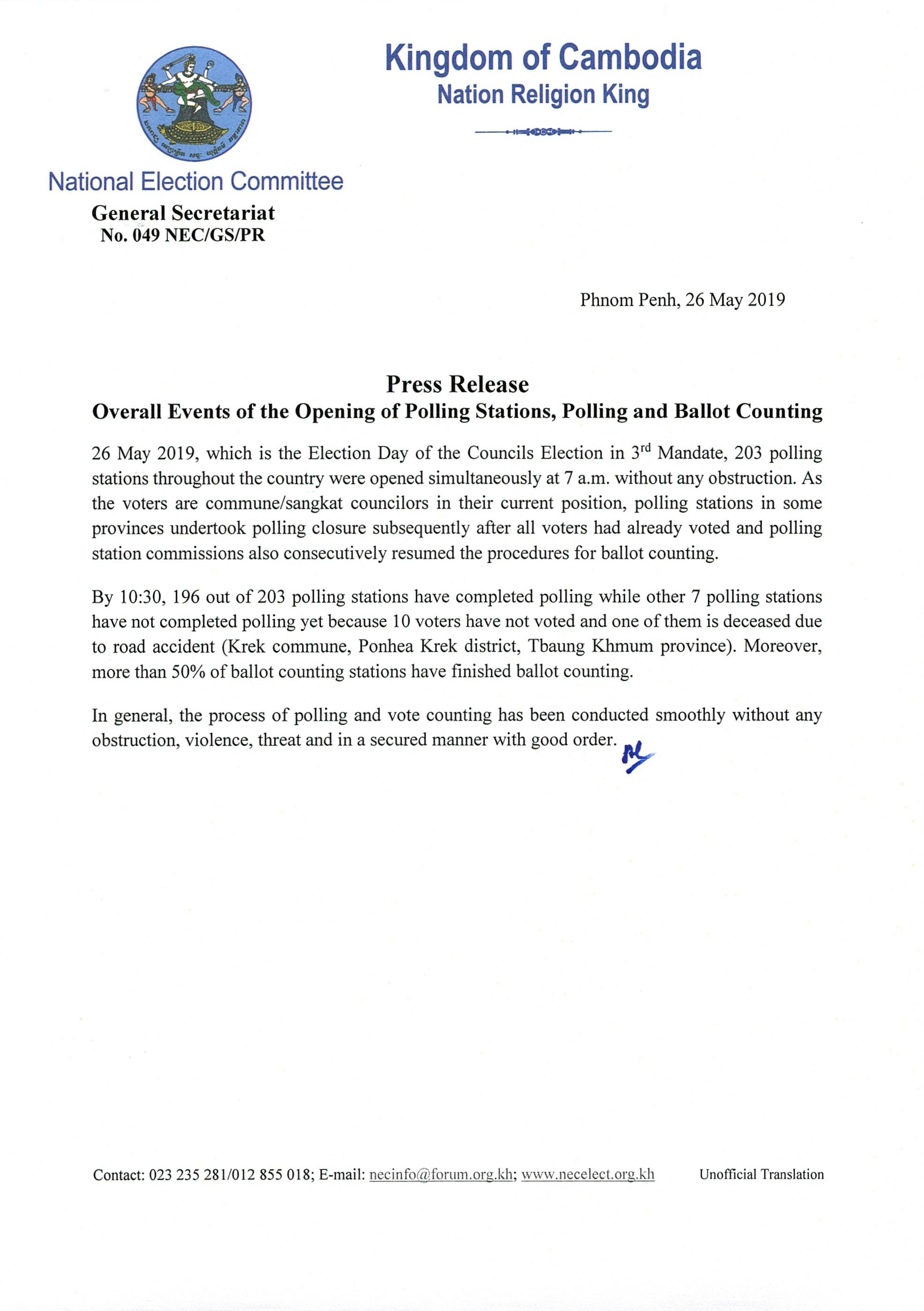 Press Release : Overall Events of the Opening of Polling Stations, Polling and Ballot Counting