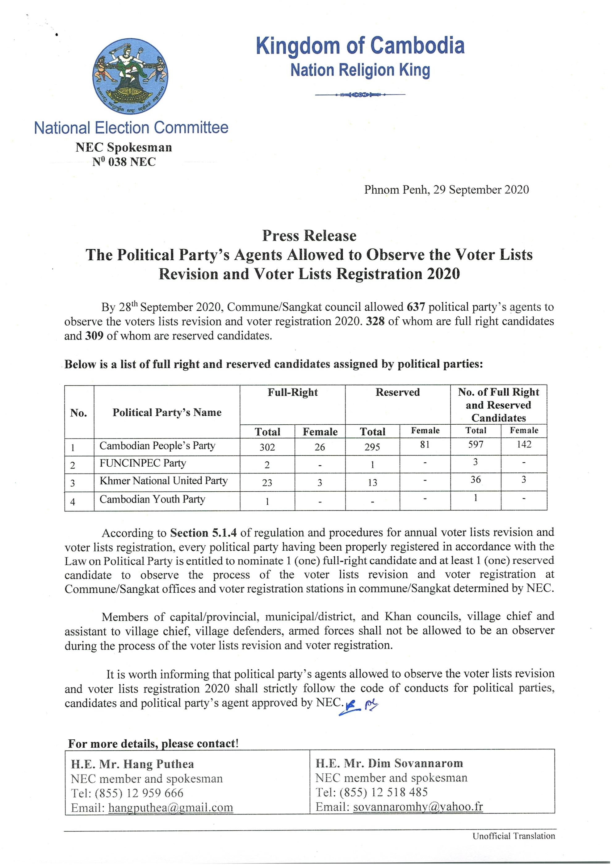 Press Release : The Political Party's Agents Allowed to Observe the Voter Lists Revision and Voter Lists Registration 2020