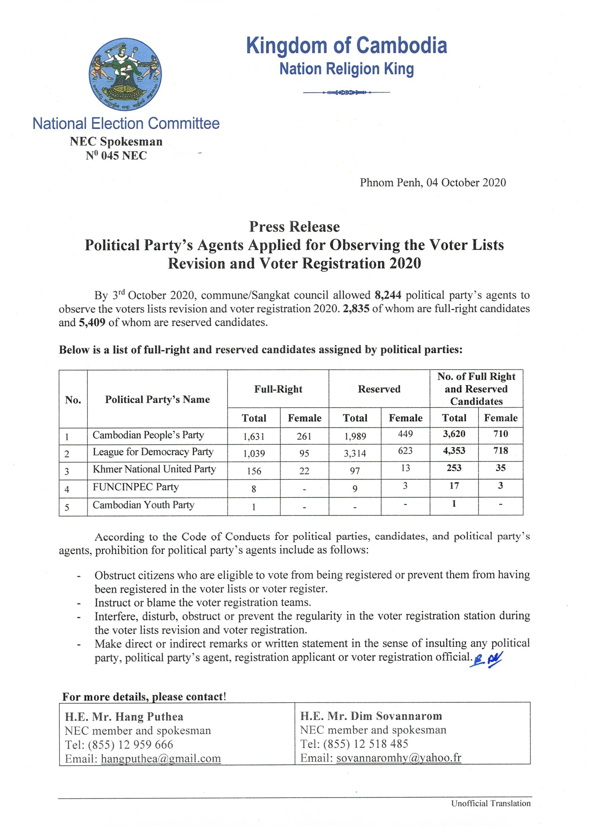 Press Release : Political Party's Agents Applied for Observing the Voter lists Revision and Voter Registration 2020