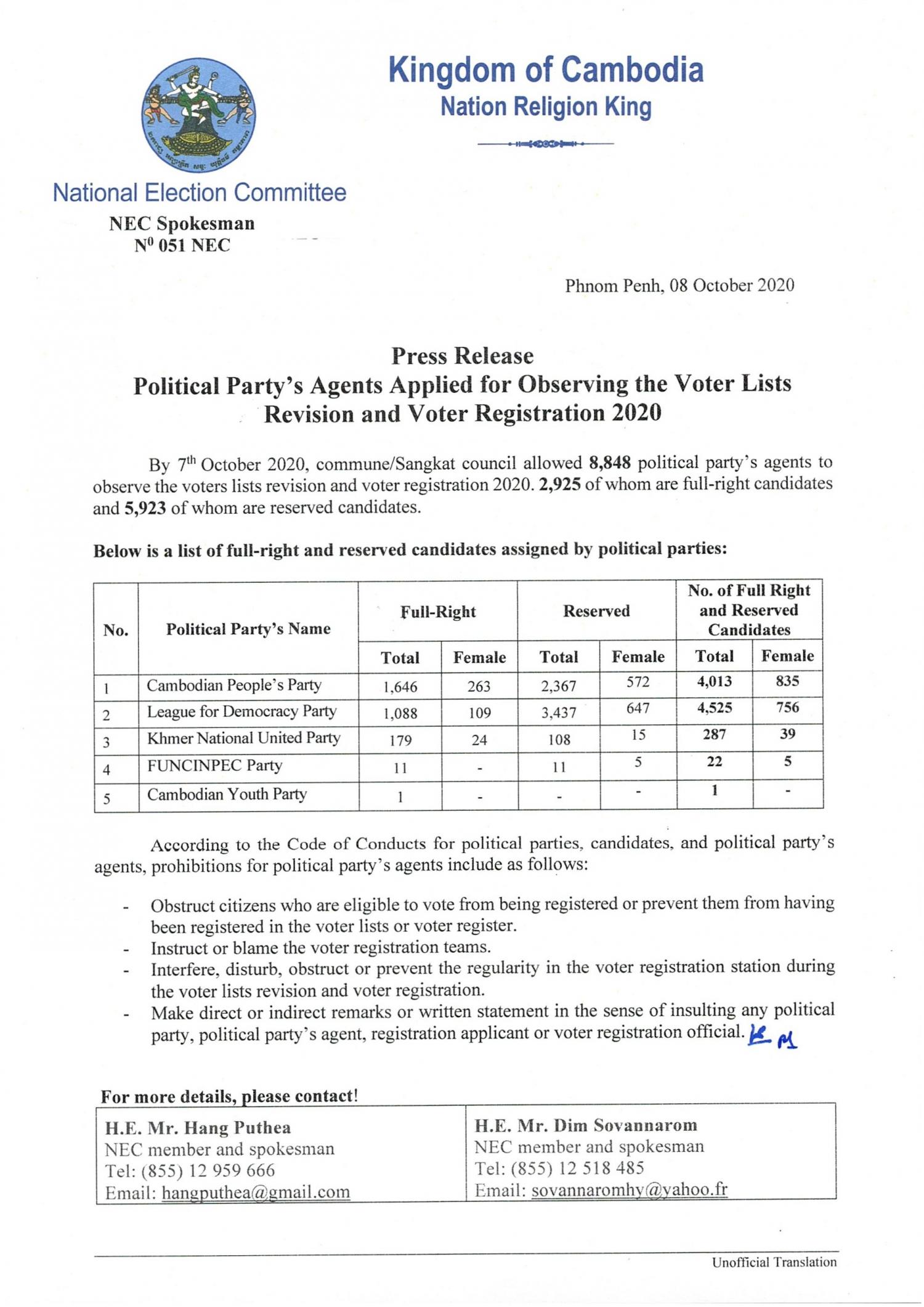 Press Release : Political Party's Agents Applied for Observing the Voter Lists Revision and Voter Lists Registration 2020