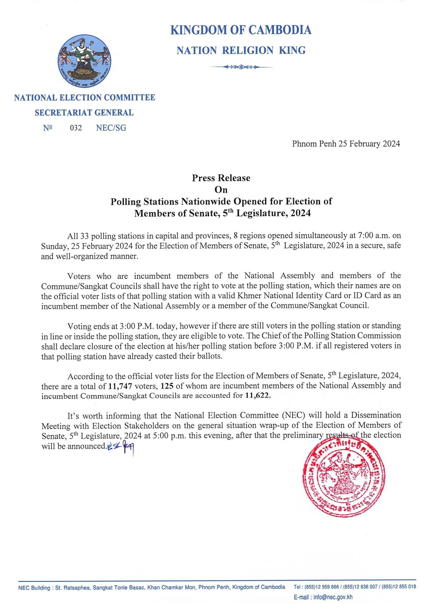 Press Release On Polling Stations Nationwide Opened for Election of Members of Senate, 5th Legislature, 2024