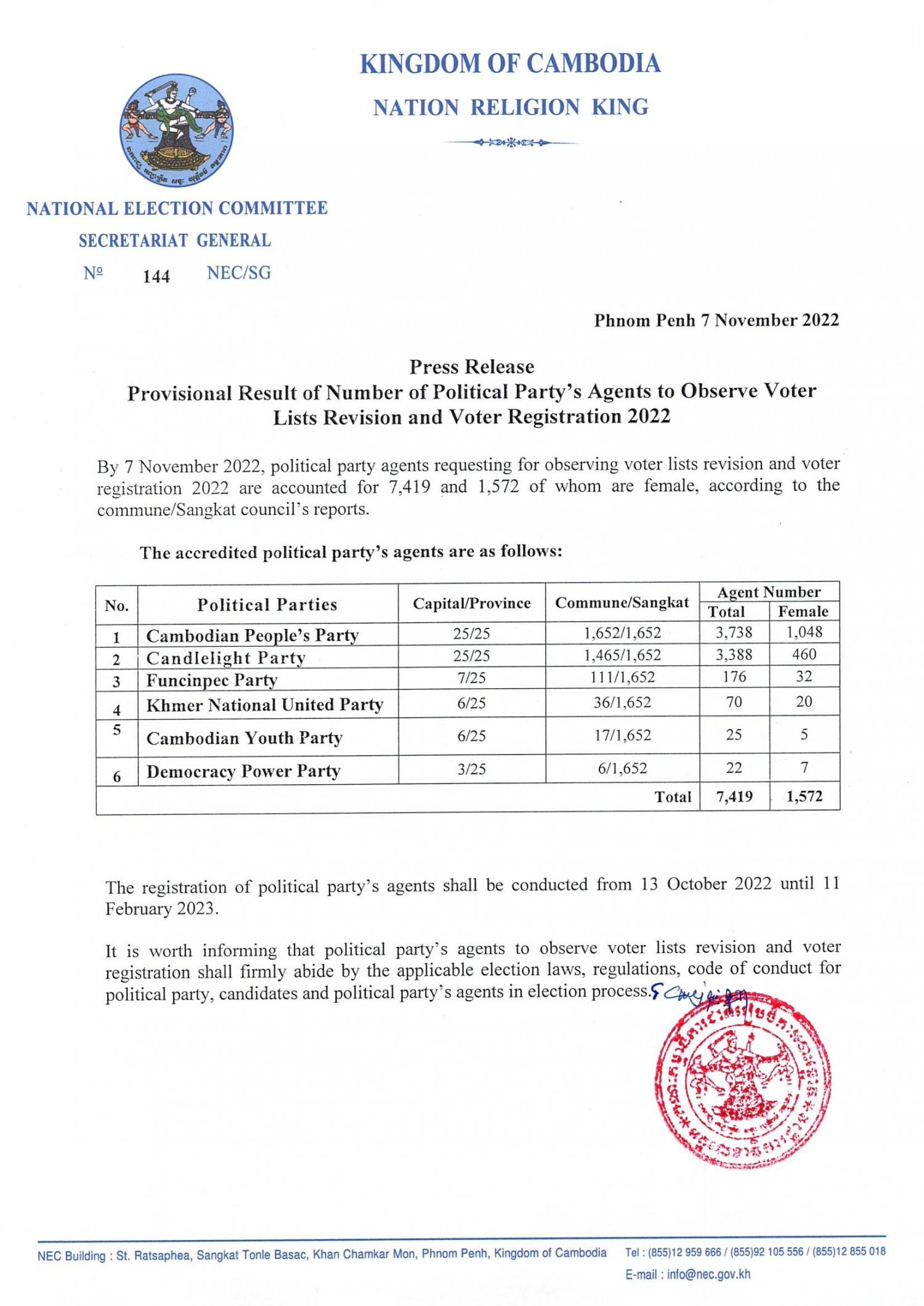 Press Release: Provisional Result of Number of Political Party's Agents to Observe Voter Lists Revision and Voter Registration 2022