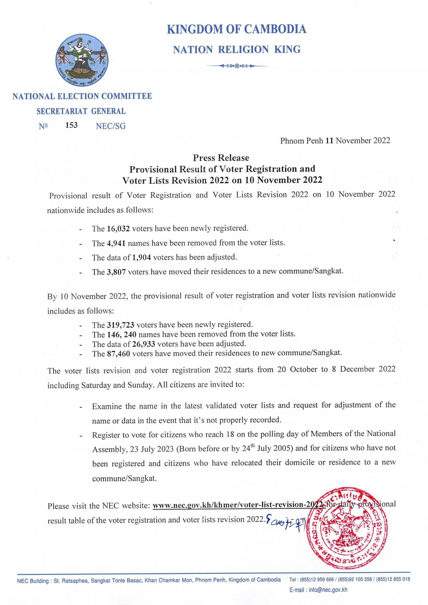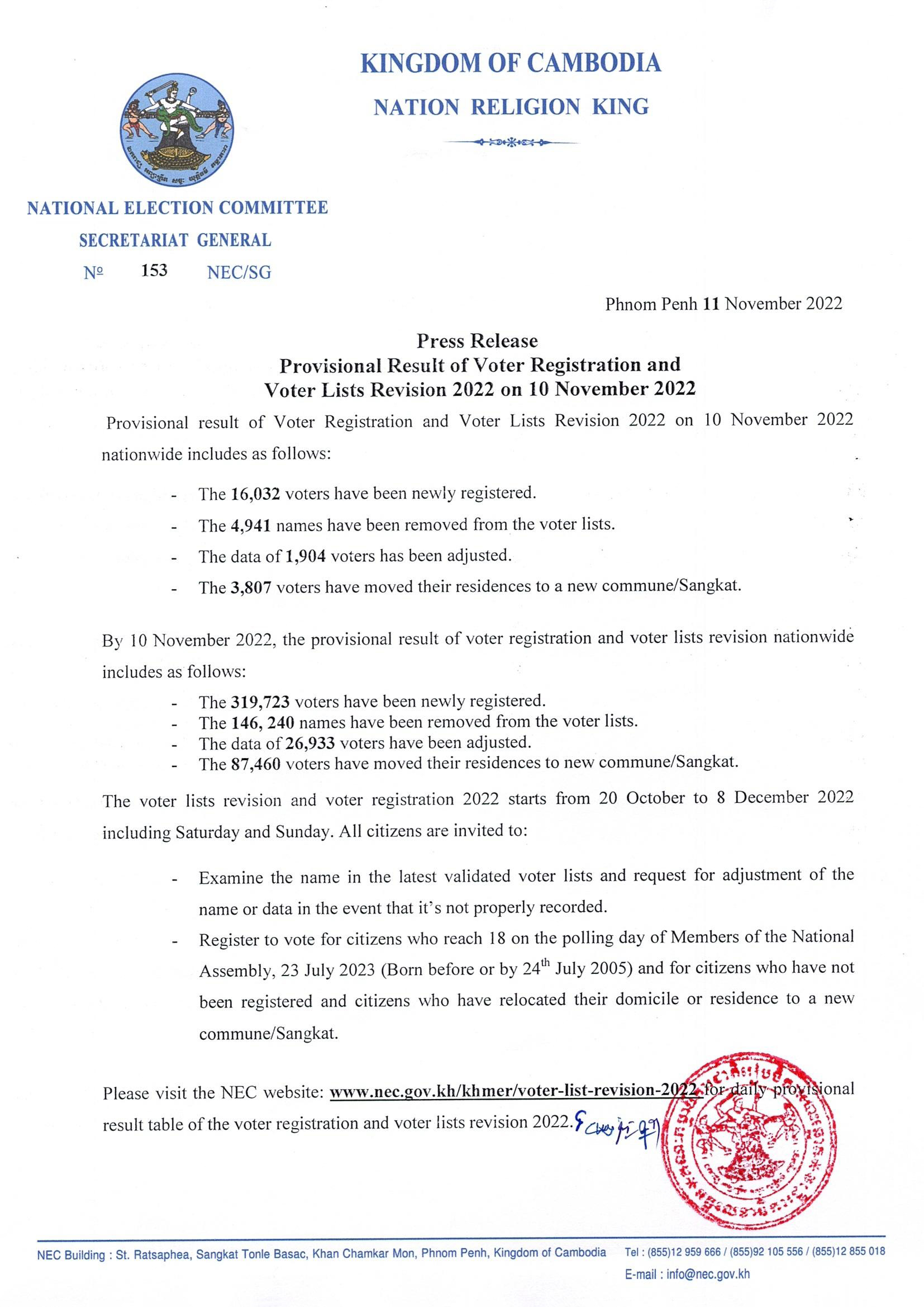 Press Release: Provisional Result of Voter Registration and Voter Lists Revision 2022 on 10 November 2022