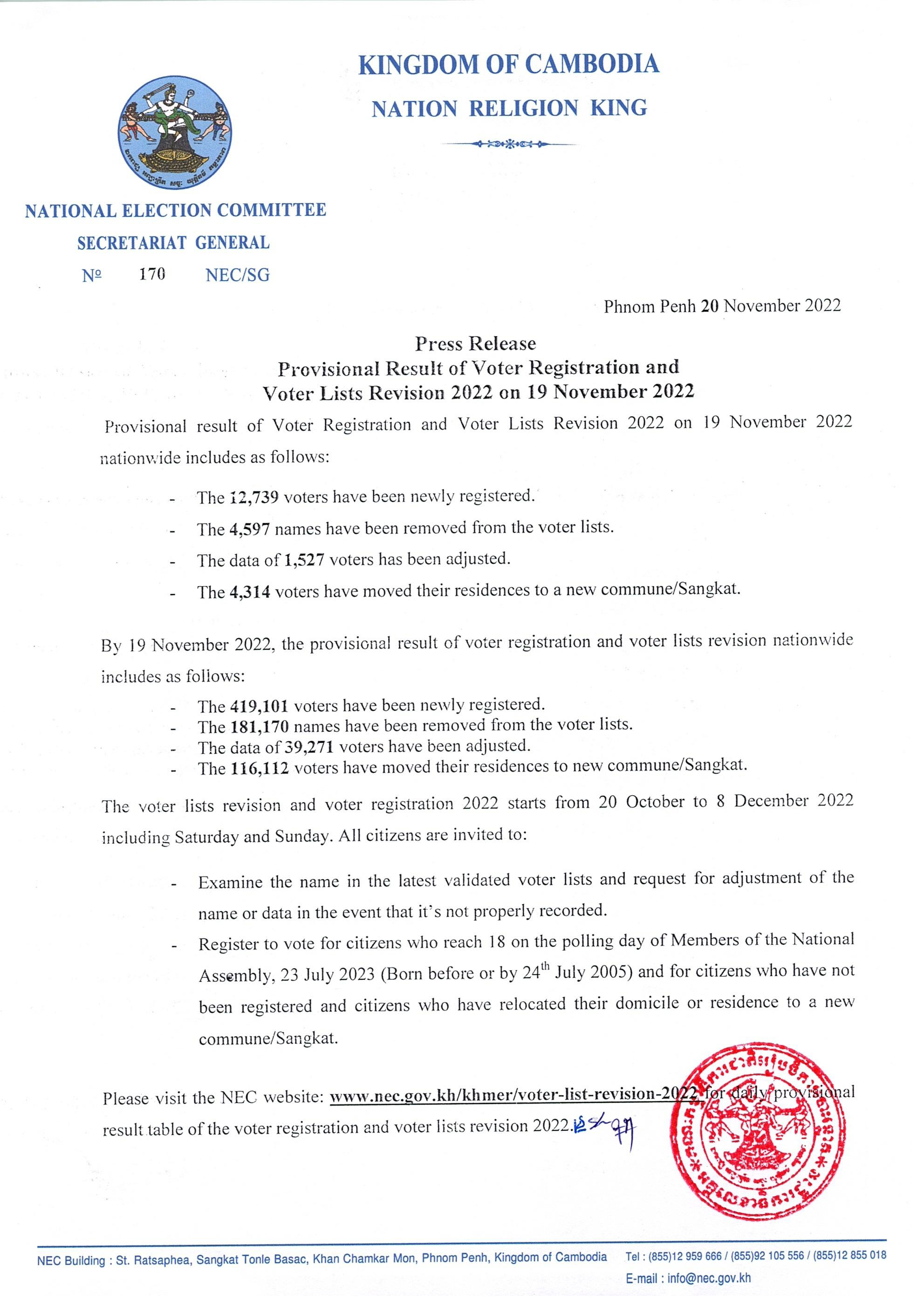 Press Release : Provisional Result of Voter Registration and Voter Lists Revision 2022 on 19 November 2022